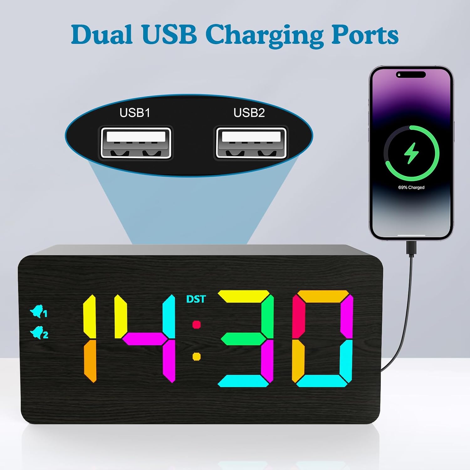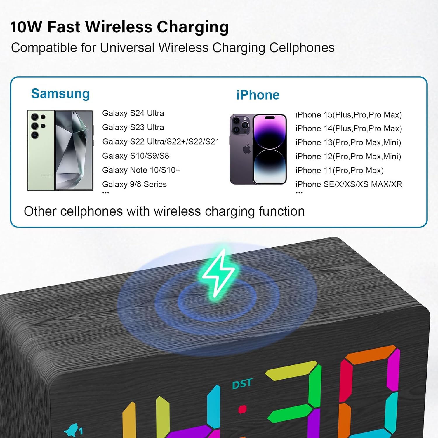 - Special Feature : Large Time Display with Bold Numbers, 0~100% Stepless Dimmer, 10W Fast Wireless Charging, 8 RGB Colors Display, Stylish Wood Grain Surface, Dual USB Charging Ports, Dual Alarm Clock, Snooze Button, Manual DST, etc. Large Time Display with Bold Numbers, 0~100% Stepless Dimmer, 10W Fast Wireless Charging, 8 RGB Colors Display, Stylish Wood Grain Surface,… See more