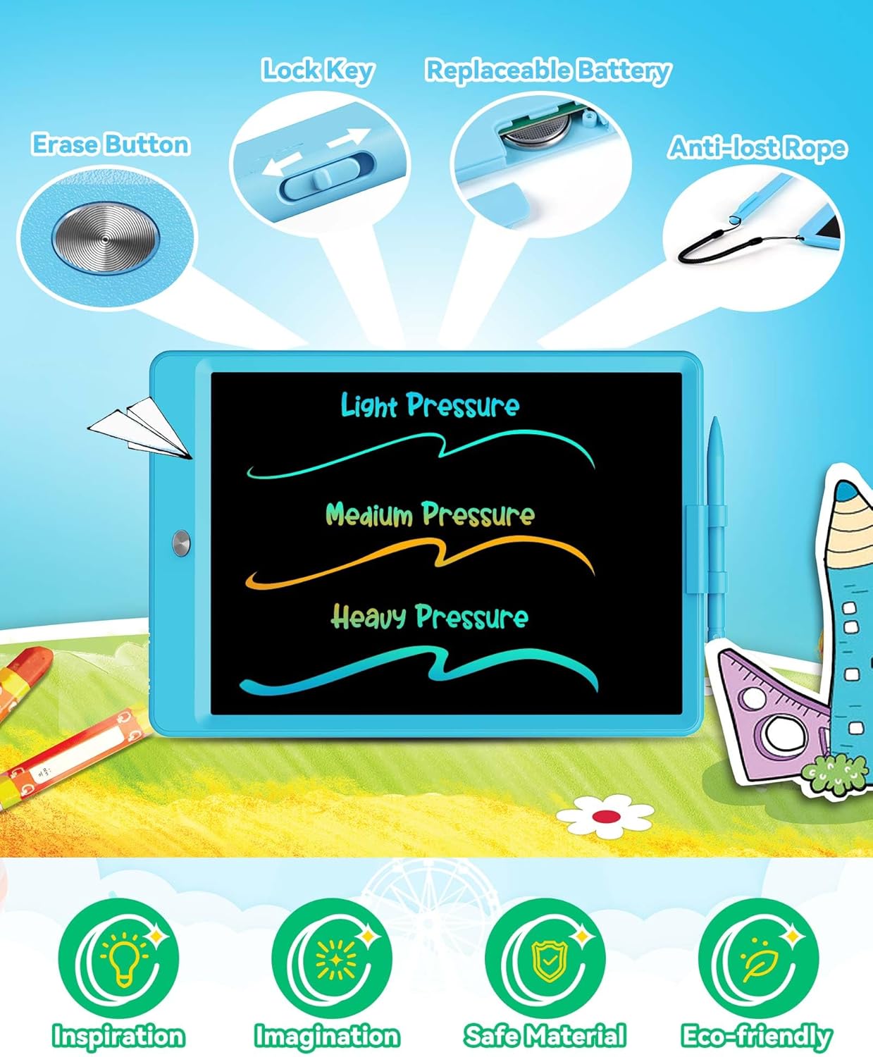 - [Reusable & Environmental]A reusable drawing tablet saves 1,000 sheets of paper. Our drawing boards are very eco-friendly because kids use these pads instead of paper. The writing tablet's battery can be used for 3-6 month and is replaceable. The battery is fixed with screws and are not easily accessible to young children.