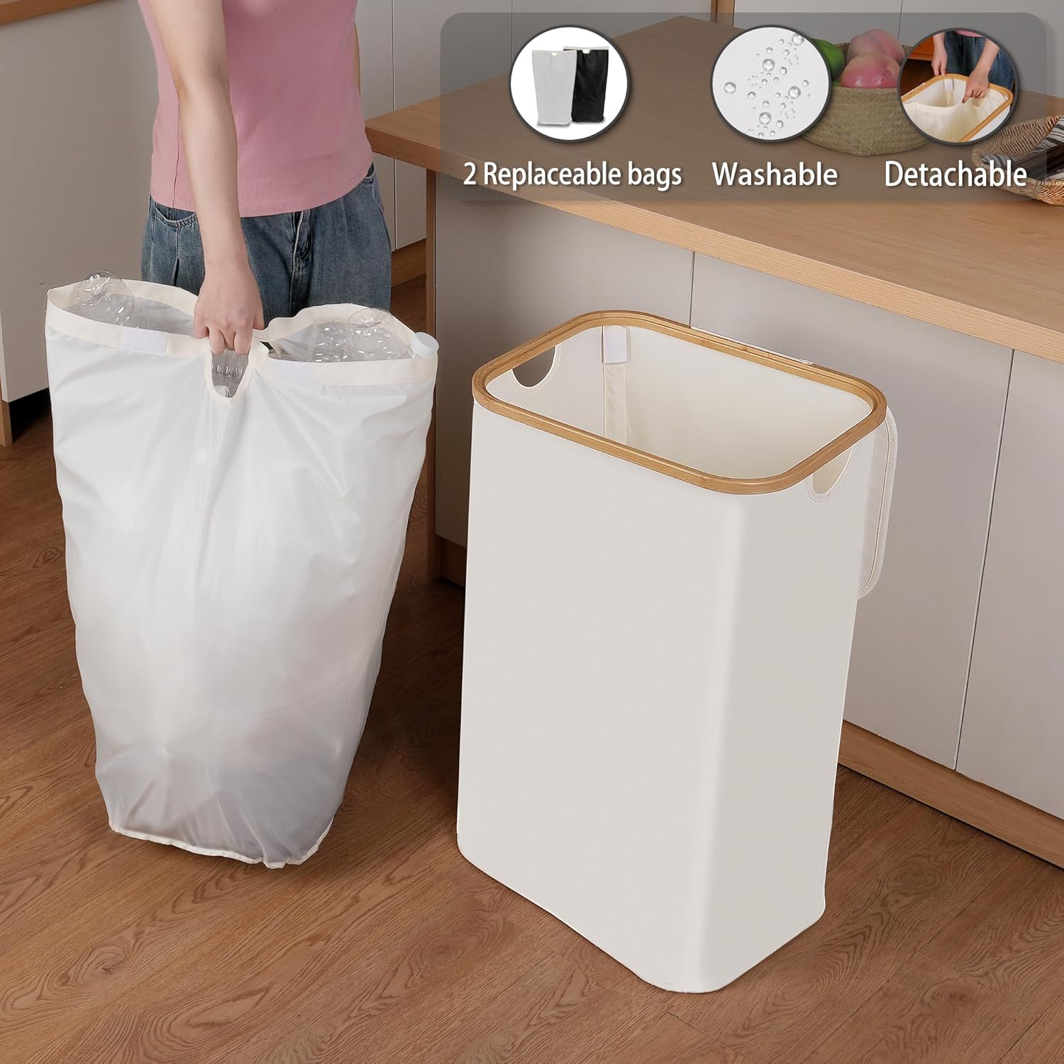 - ♻【Waterproof and Durable】Made of sturdy materials including thickened fabric and bamboo handle, this indoor recycle bins is durable and long-lasting. The thick fabric can accommodate up to 110 liters of bottles, ensuring durability and wear resistance. The rust-resistant bamboo handle is lightweight and easy to carry for anyone, including pregnant women, elderly, and children.