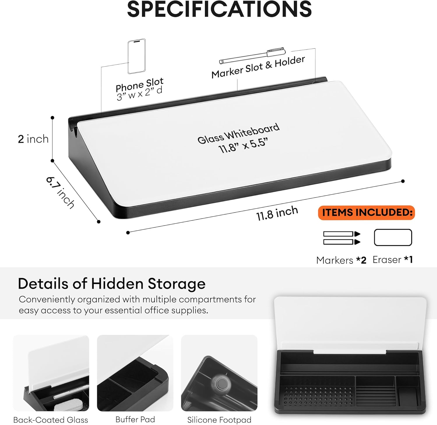 Glass Desktop Whiteboard with Storage 12"x6.5", Glass Whiteboard Desk Dry Erase Board w. 2 Markers,1 Eraser Monitor Mono Board, Office Desk Accessories, Work from Home Essentials