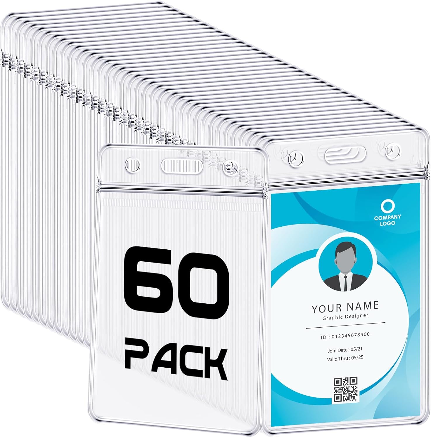 BESARME 60 Pack Vertical ID Card Badge Holder Clear Plastic Sealable Waterproof Zip Name Tag for Work Office Nurse School
