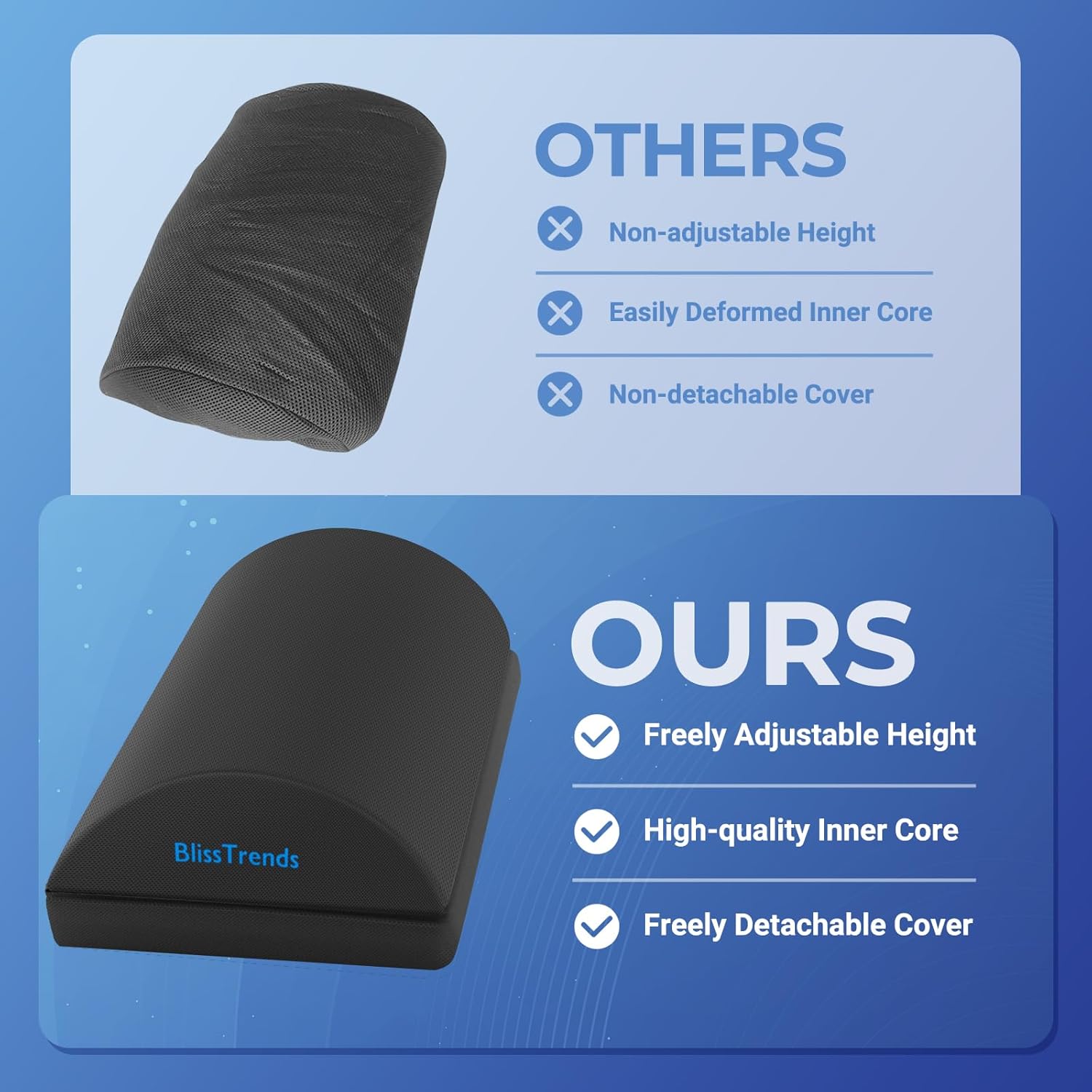 - 【High Quality Material】 The core of BlissTrends foot pillow is made of high quality foam, which is supportive and does not easily collapse or lose shape. The bottom of the foot pillow is made with a non-slip design, which ensures that the foot pillow does not easily shift when being used.