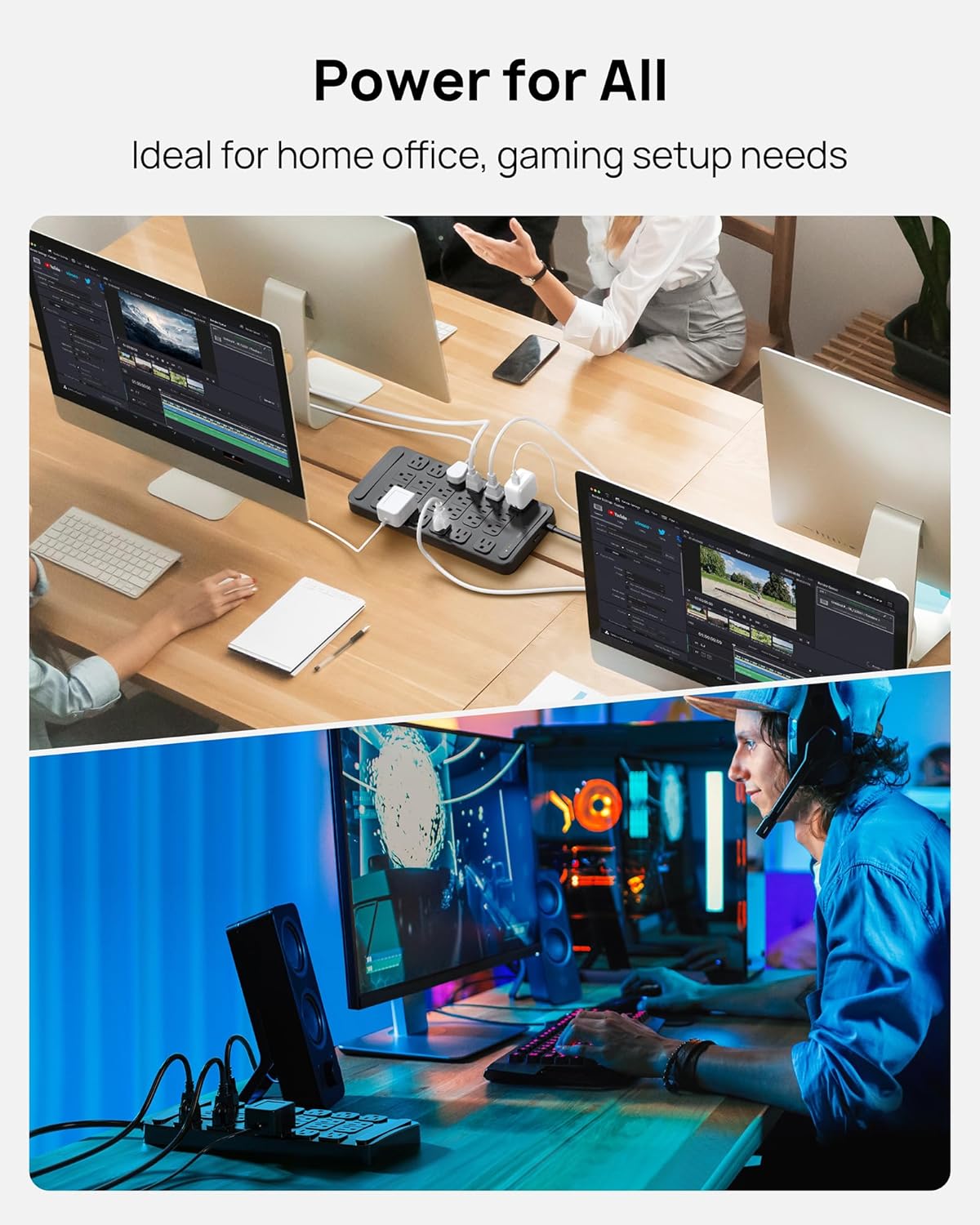 - 4000 Joules Surge Protection: Safeguard your valuable electronics with 4000 Joules of advanced surge protection. This power strip shields your devices from unexpected voltage spikes, extending their lifespan and preventing potential damage. An easy-to-use on/off switch allows for quick resets and added safety