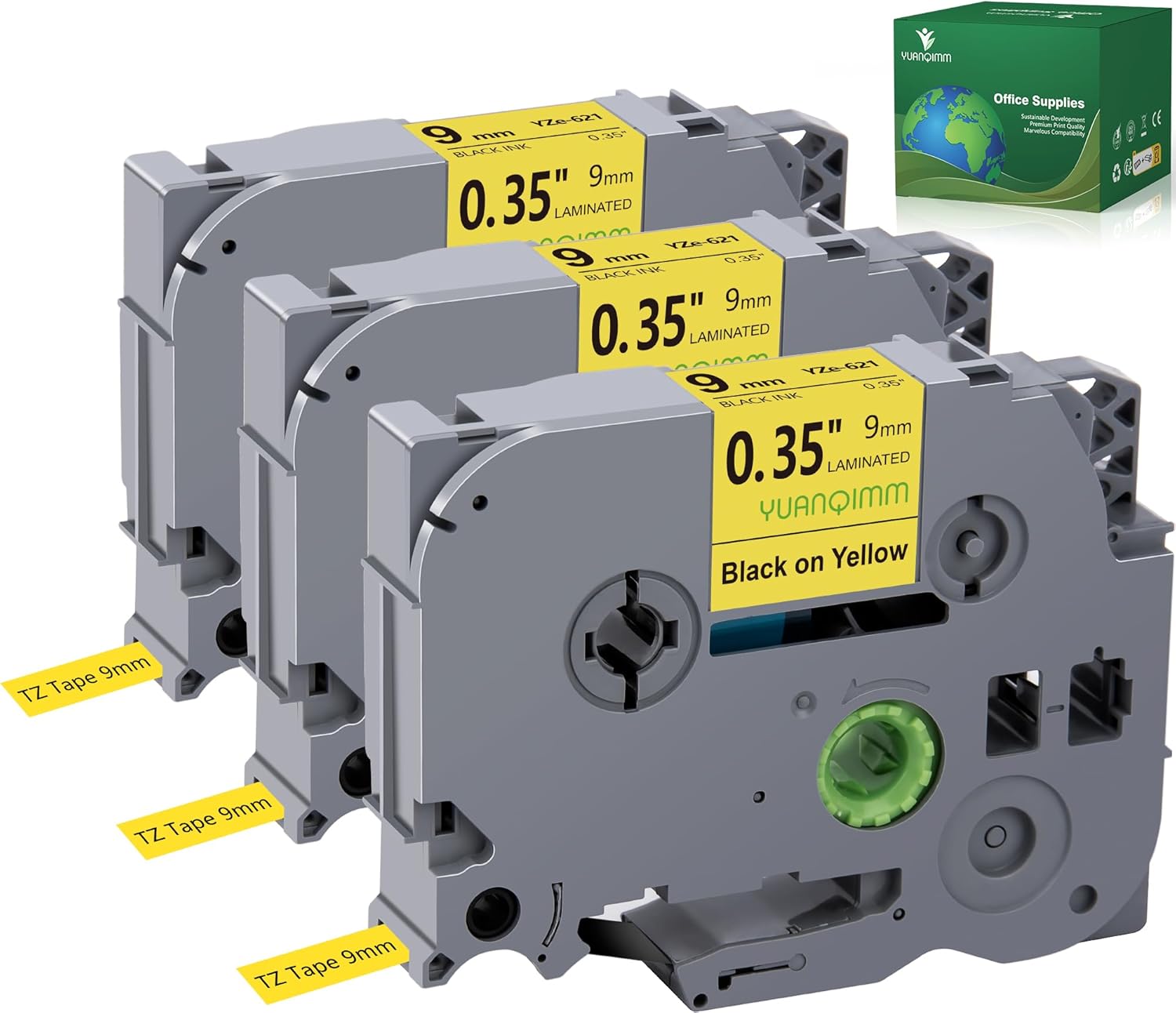 - Package included: 3-Pack Compatible with Brother PTouch TZe-621 TZ-621 TZe621 TZ621 9mm 0.35 Inch Black on Yellow Label Maker tape