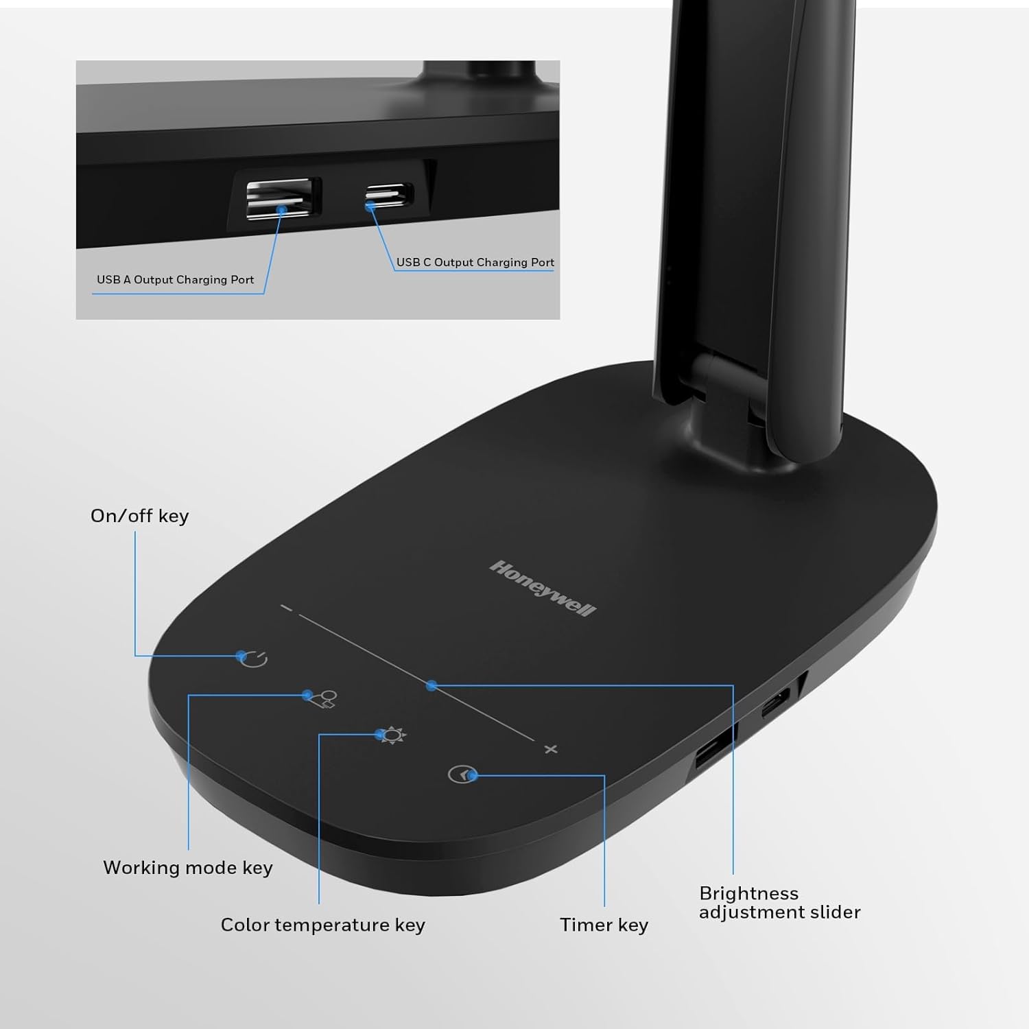 HONEYWELL LED Desk Lamp - HWT-H2 Sunturalux™ Eye-Caring Foldable Desk Light with USB A+C Dual Charging Port 4 Color Modes Dimmable Table Lamp for Home Office Bedroom Reading Study Work - Black
