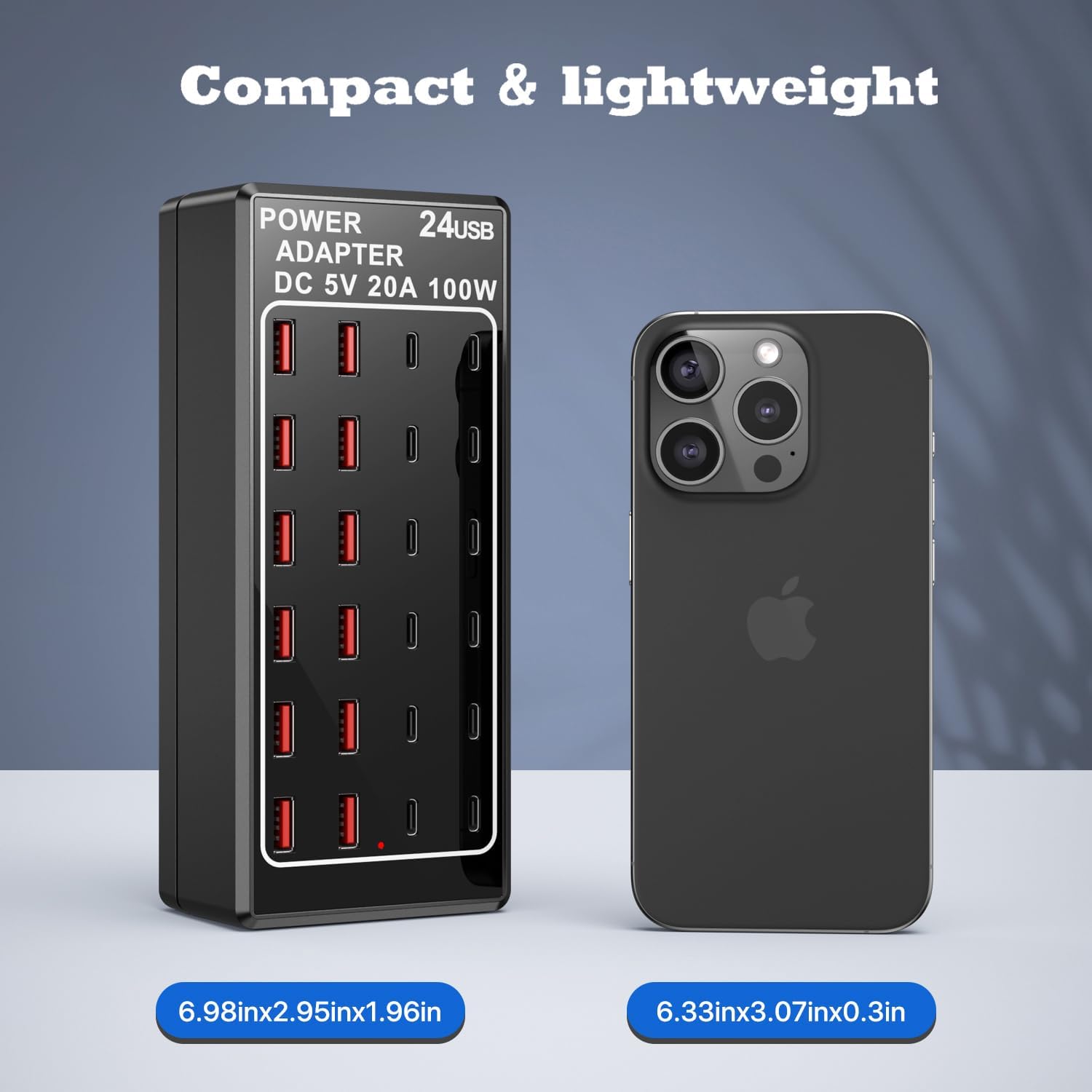 - ⚡【24 Port Charging Station】USB Charger Station Block with 12-USB-C ports and 12-USB-A ports(Each port max 2.4A), allowing multiple devices to charge simultaneously, with a total output of up to 100W. The USB C Charger Block provides the fastest charging speed and intelligently detects the power demand of each port of the connected device, ensuring safe and fast charging of the charger.