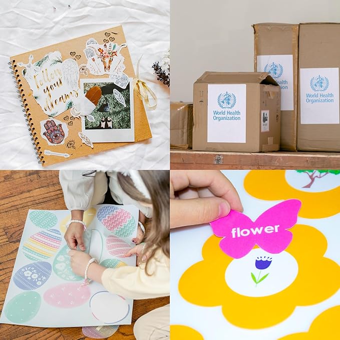 - ✅[ Customizable Adhesive Paper ] Full sheet label paper white gives you the freedom to design stickers in different sizes and shapes. Great for DIY personalized stickers for car bumpers, glasses, bottles, Laptops, laptops, and more. Adhere to metal, plastic, glass, tin, paper, cardboard, corrugated boxes, envelopes, plastic bags, and more.