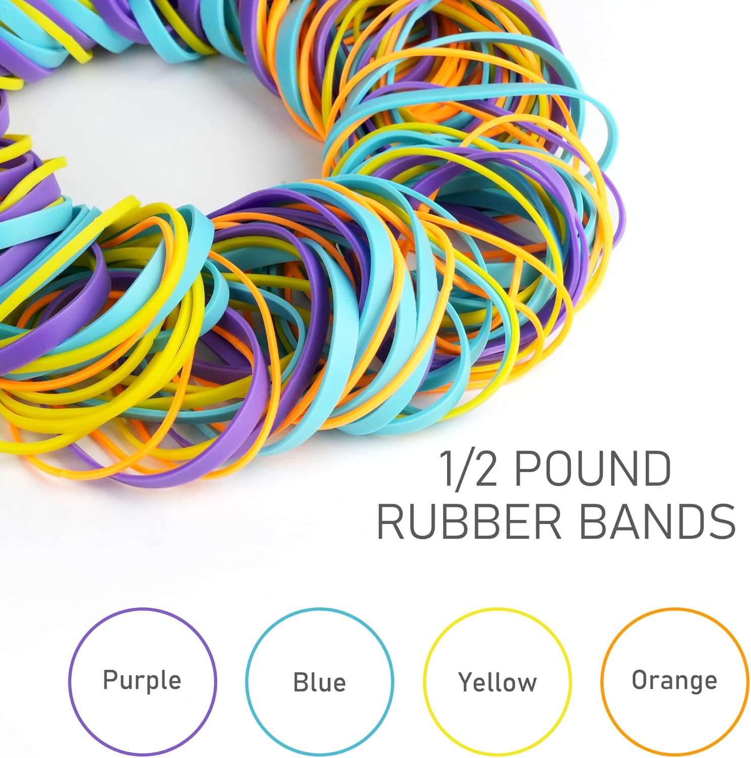 - Package includes 1/2-pound rubber bands in bright, assorted colors: purple, yellow, blue, and orange