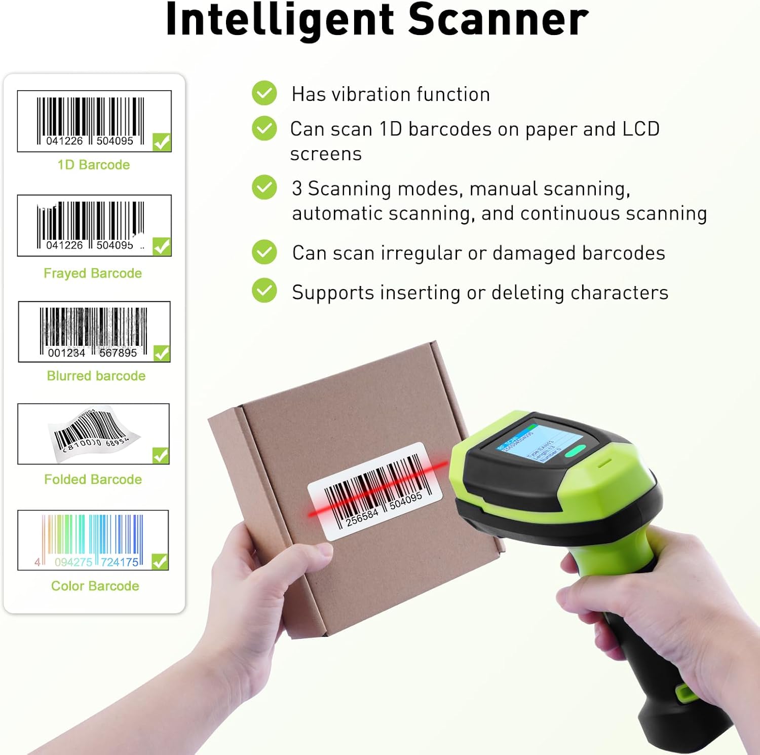 - 【LCD Display Screen】: This handheld barcode scanner is also specially designed with a 1.8-inch high-definition LCD display, allowing you to easily view remaining power, barcodes, barcode types, barcode lengths, and barcode quantities.