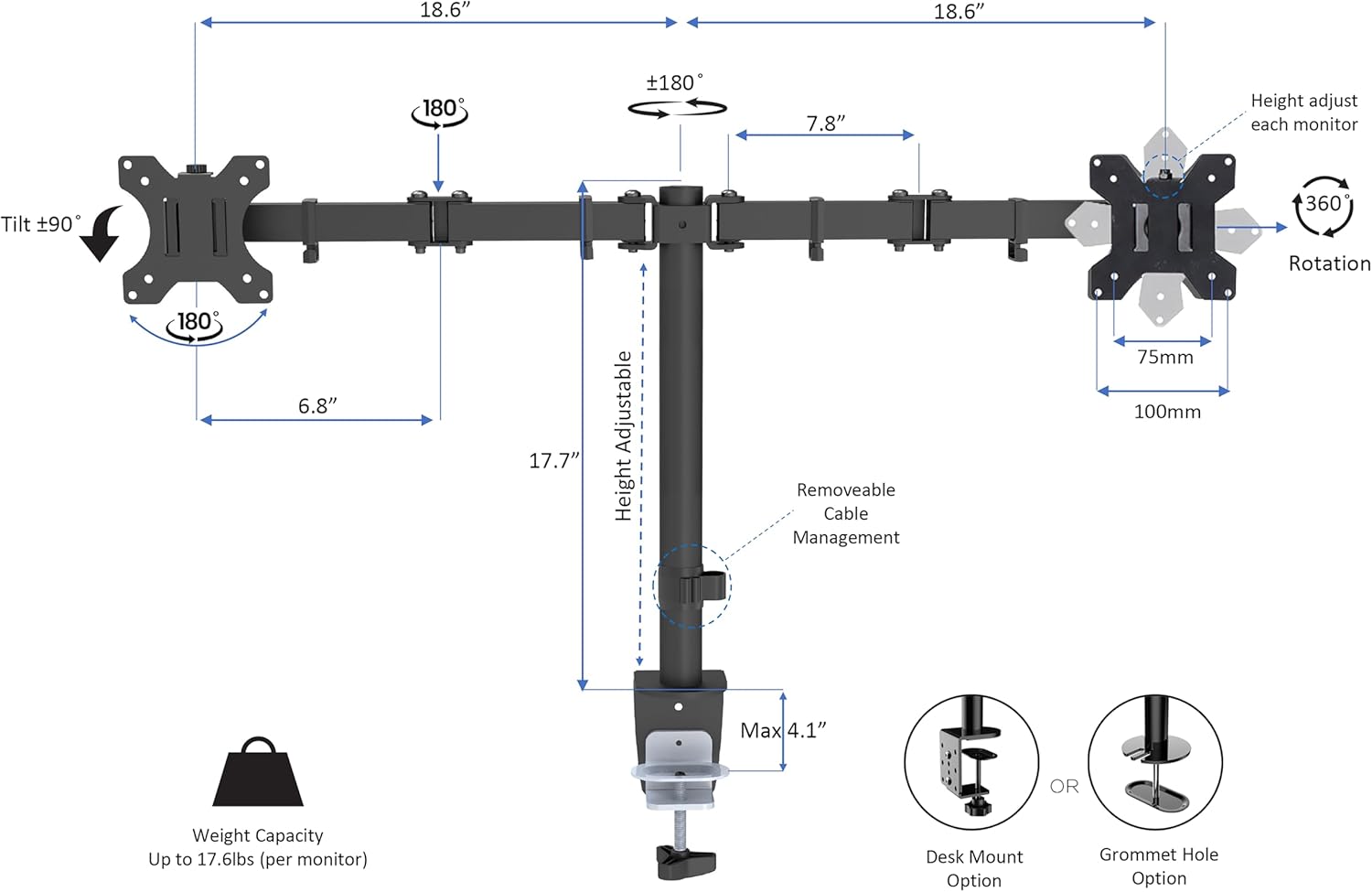 - Standing Desk Converter Bundle includes 46" corner desk riser (R CADRB-46-ACUSB) and Dual Monitor Arm (R DM2) for easy ergonomic positioning of 13"-27" flat panel monitors to optimize viewing comfort. R DM2 includes a grommet mount to install.