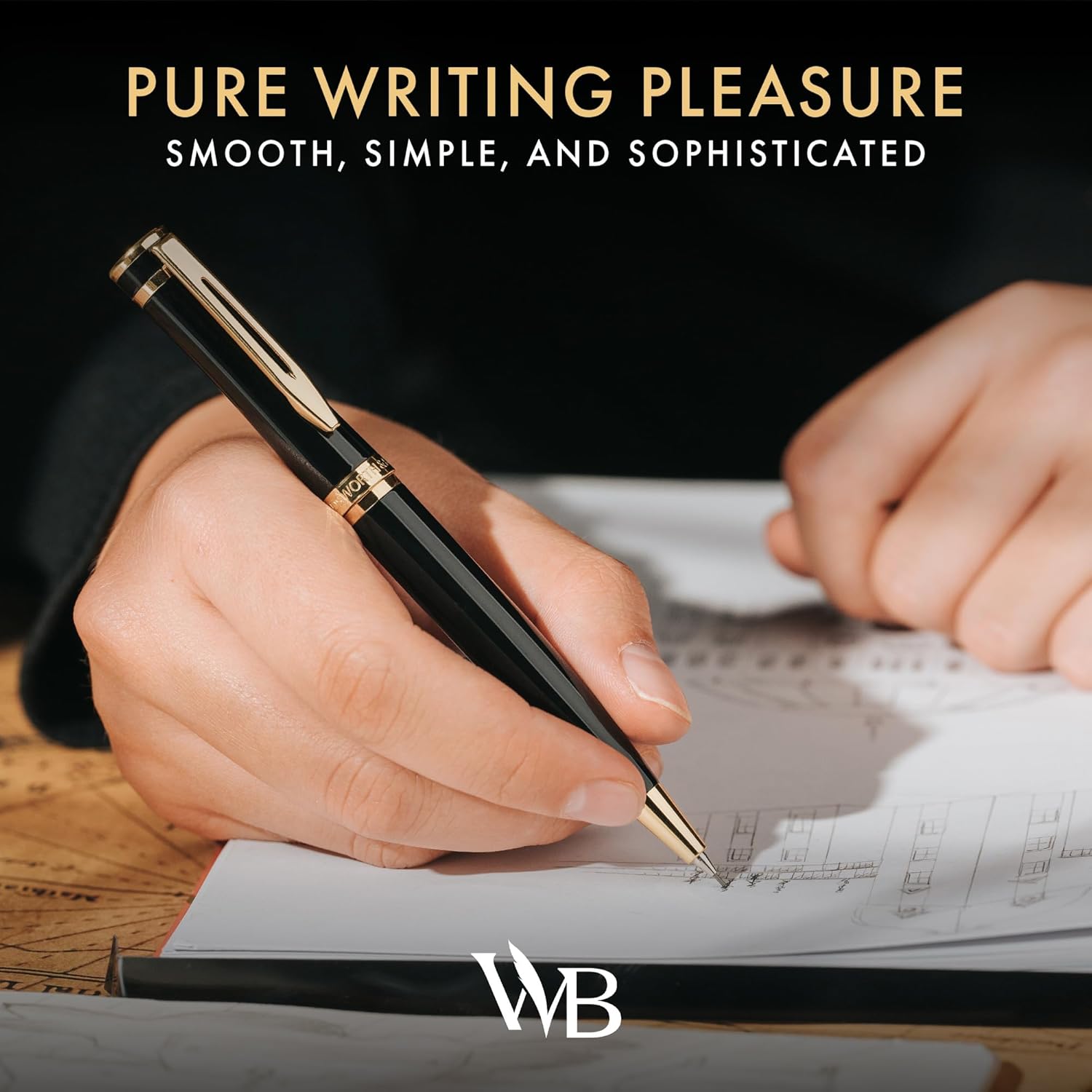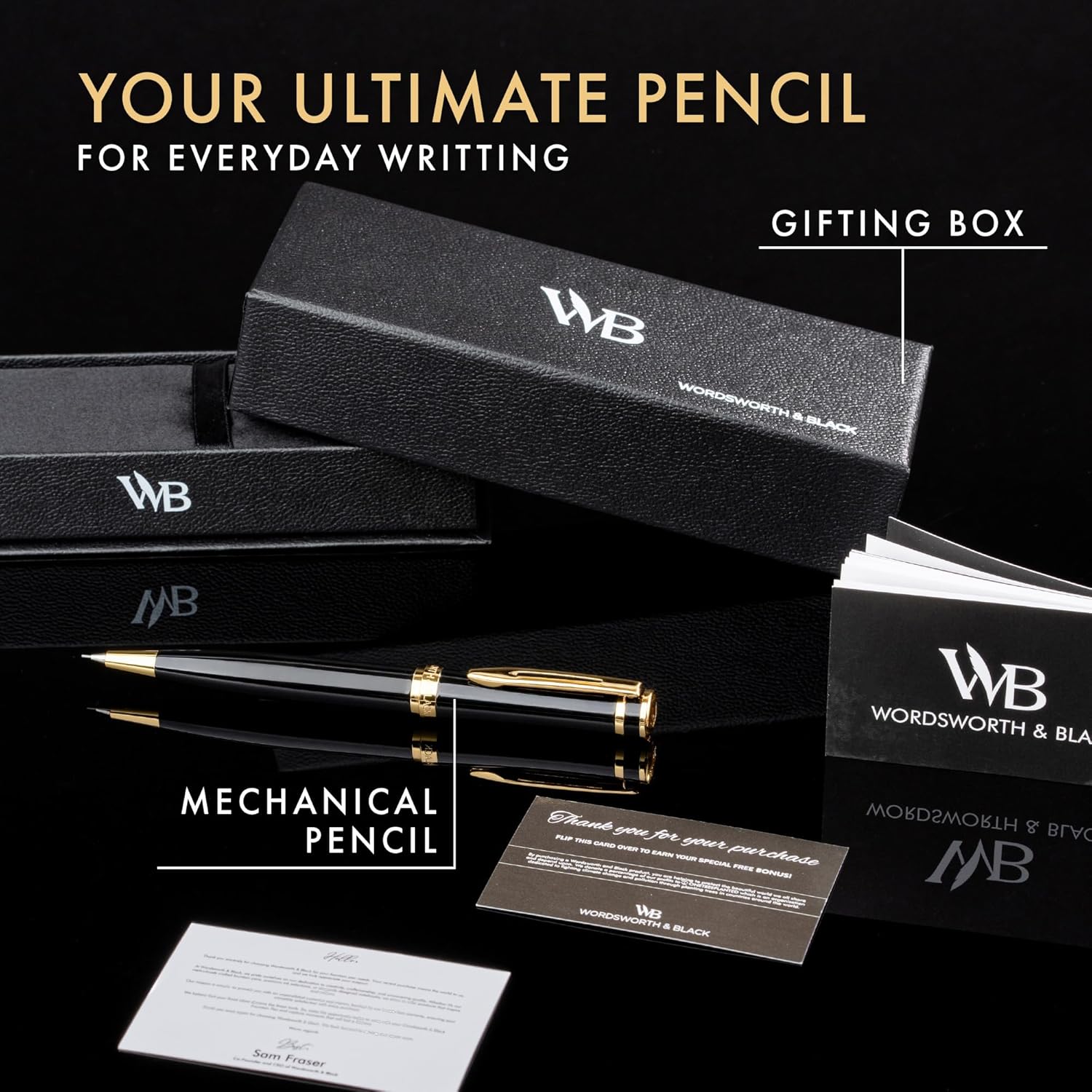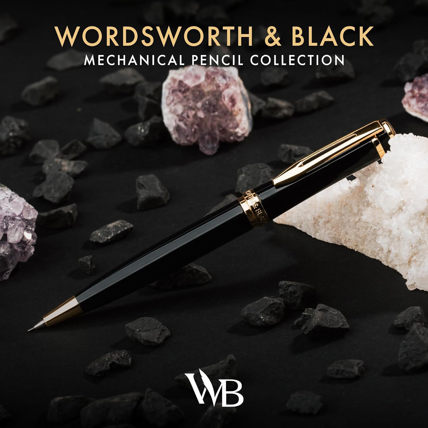 Wordsworth and Black Mechanical Pencil Graphite Lead- Stunning Luxury Metal Pencil, Black Lacquer 24K Gold Finish, 0.7mm Led, Best Gift Set for Men & Women, Professional Executive Office Pencils