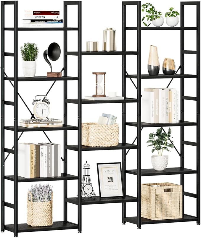 NUMENN Triple Column 5 Tier Bookshelf, Bookcase with 14 Open Display Shelves, Adjustable Rustic Industrial Style Book Shelves, Modern Bookshelves for Bedroom, Living Room and Home Office, Black