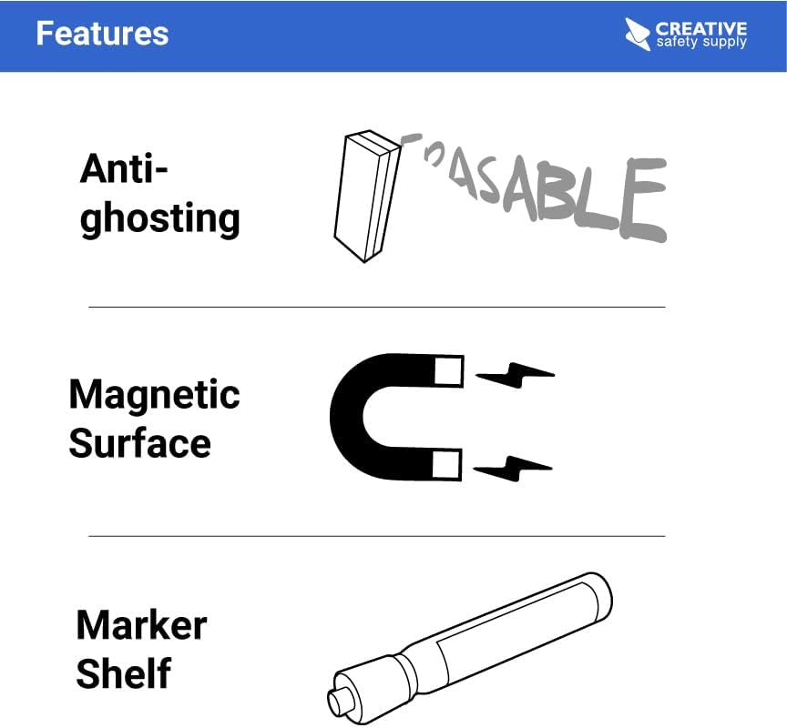 - Magnetic Dry-Erase Surface – Vinyl-printed surface resists stains and ghosting for long-term visibility and smooth writing performance