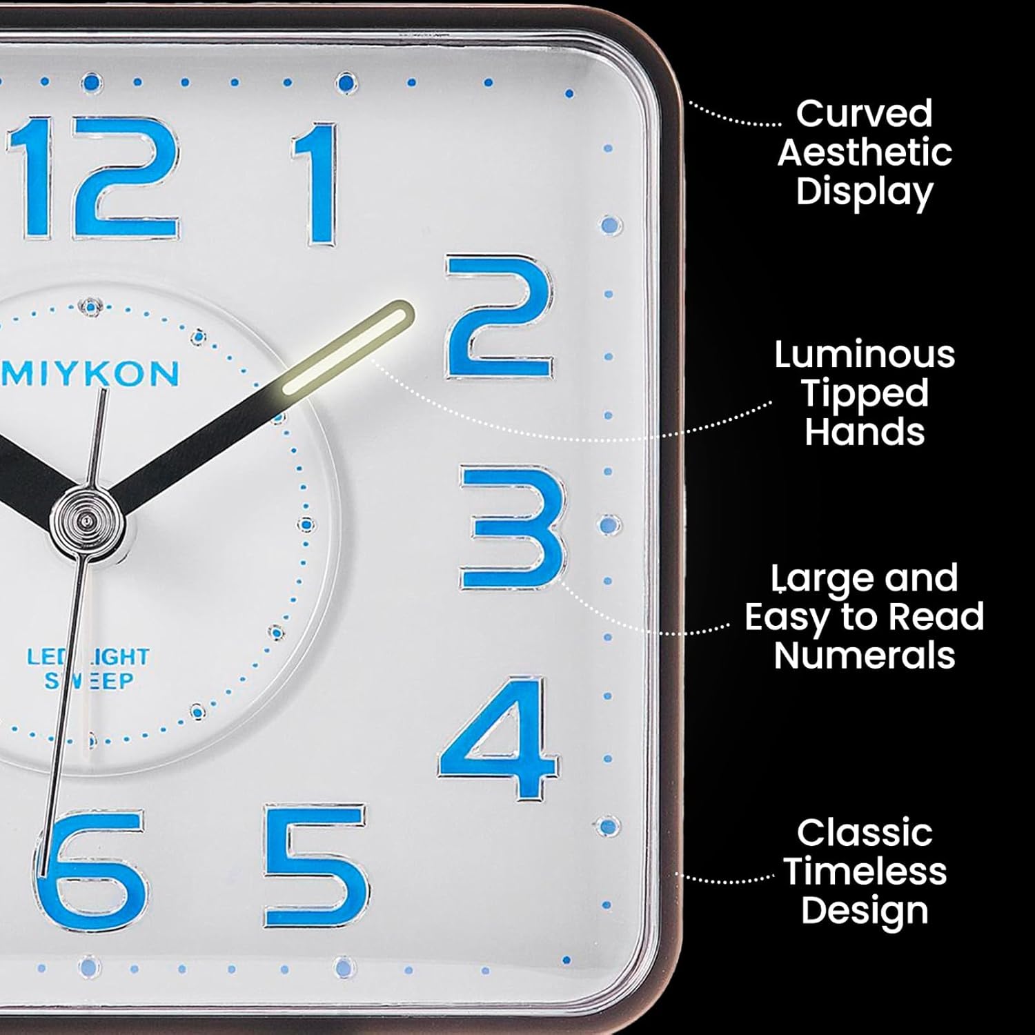 Miykon Small Square Analog Alarm Clock – Silent Non-Ticking, Battery Operated with LED Light & Snooze – Desk, Table, Travel or Bedside Clock for Bedroom, Office, Bathroom – Black 4 Inch