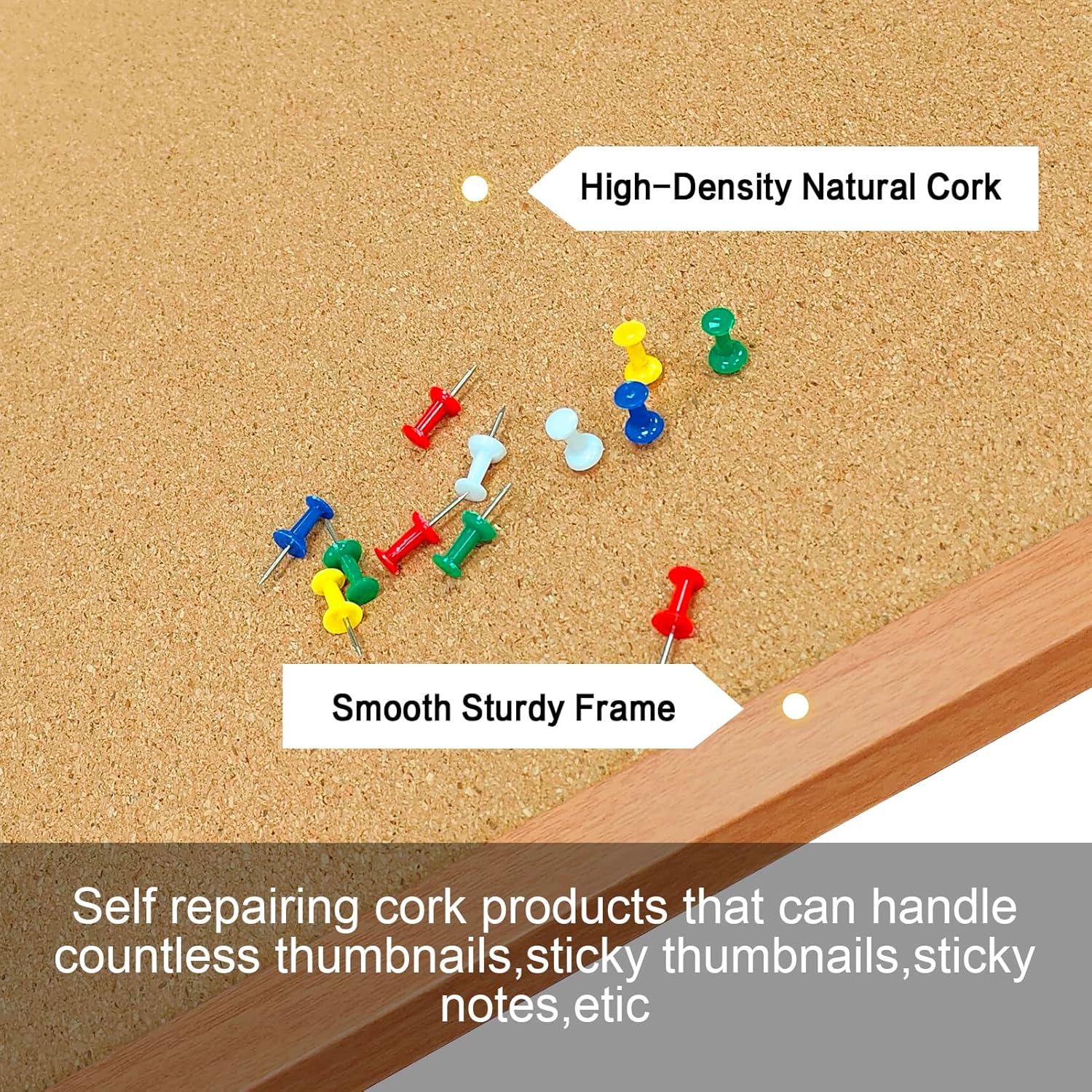 - Eco-friendly materials: The light weight and high-density cork, which holds pin firmly in the place. It has strong self-healing ability with no pinholes left when pins are removed.