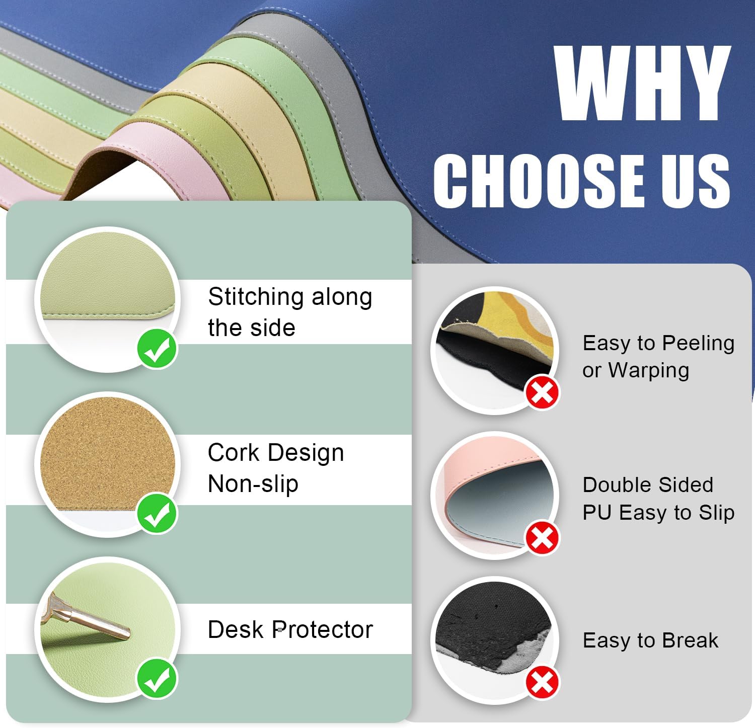 Non Slip Desk Mat, 31.5" x 15.7" PU Leather Desk Pad, Cork Desk Mat for Desktop, Desk Pad for Keyboard and Mouse, Ideal for Office and Home, Matcha