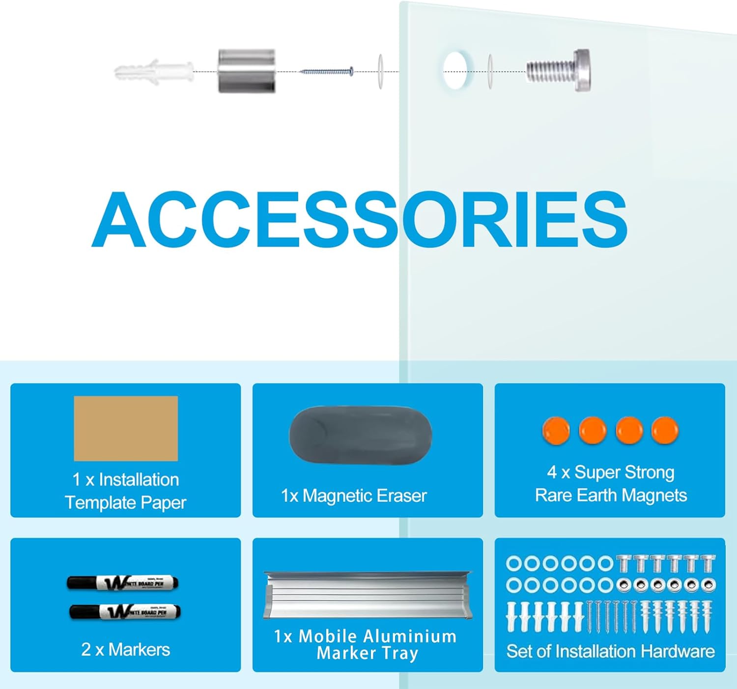 - COMPREHENSIVE ACCESSORIES SET: Comes with one 72" x 48" frameless tempered glass whiteboard, two markers, four magnets, one eraser and one marker tray for mounting. Pay special attention to the magnetism will not be strong due to the thickness of the glass, standard magnets do not work. Please use silvery super strong rare earth magnets. Don't use normal black magnet and fridge magnet