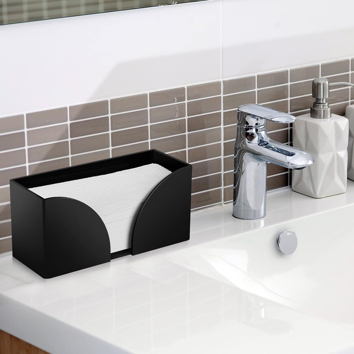 - 【PRACTICAL PAPER TOWEL HOLDER】This bathroom paper towel holder is not only practical but also stylish. Its simple style matches any decor, whether you place it in your bathroom, kitchen, or office. This commercial paper towel dispenser can be placed on tables, shelves, desks, and other smooth surfaces, keeping napkins and fingertip towels clean, neat, and organized on your kitchen counter, banquet table, or bathroom vanity.