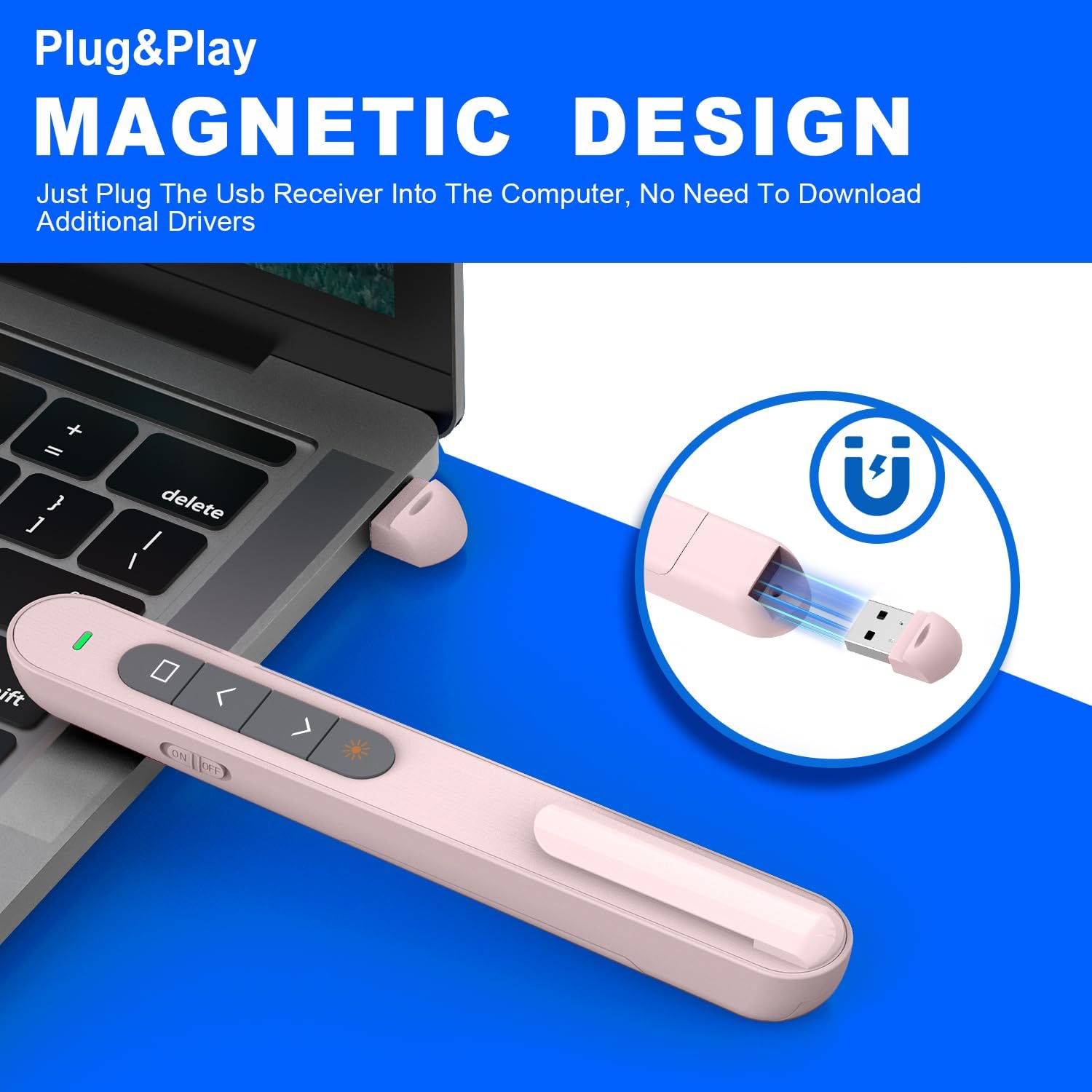 - 【PLUG & PLAY PRESENTATION CLICKER】The intuitive touch buttons of this presenter clicker integrate hyperlink navigation, page up/down, volume control, power switch, and full screen/black screen functions. No software is required, just connect the magnetic 2.4 GHz USB receiver at the bottom of the clicker to your computer and it's ready to use. (Powered by 1 AAA Battery is not included)
