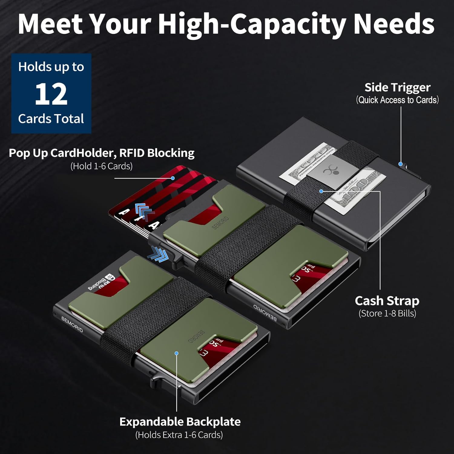 Slim Wallet for Men, RFID Blocking Mens Wallets, Minimalist Pop Up Men's Credit Card Holder, Sturdy Metal Card Case with Cash Strap - 12+ Cards Capacity