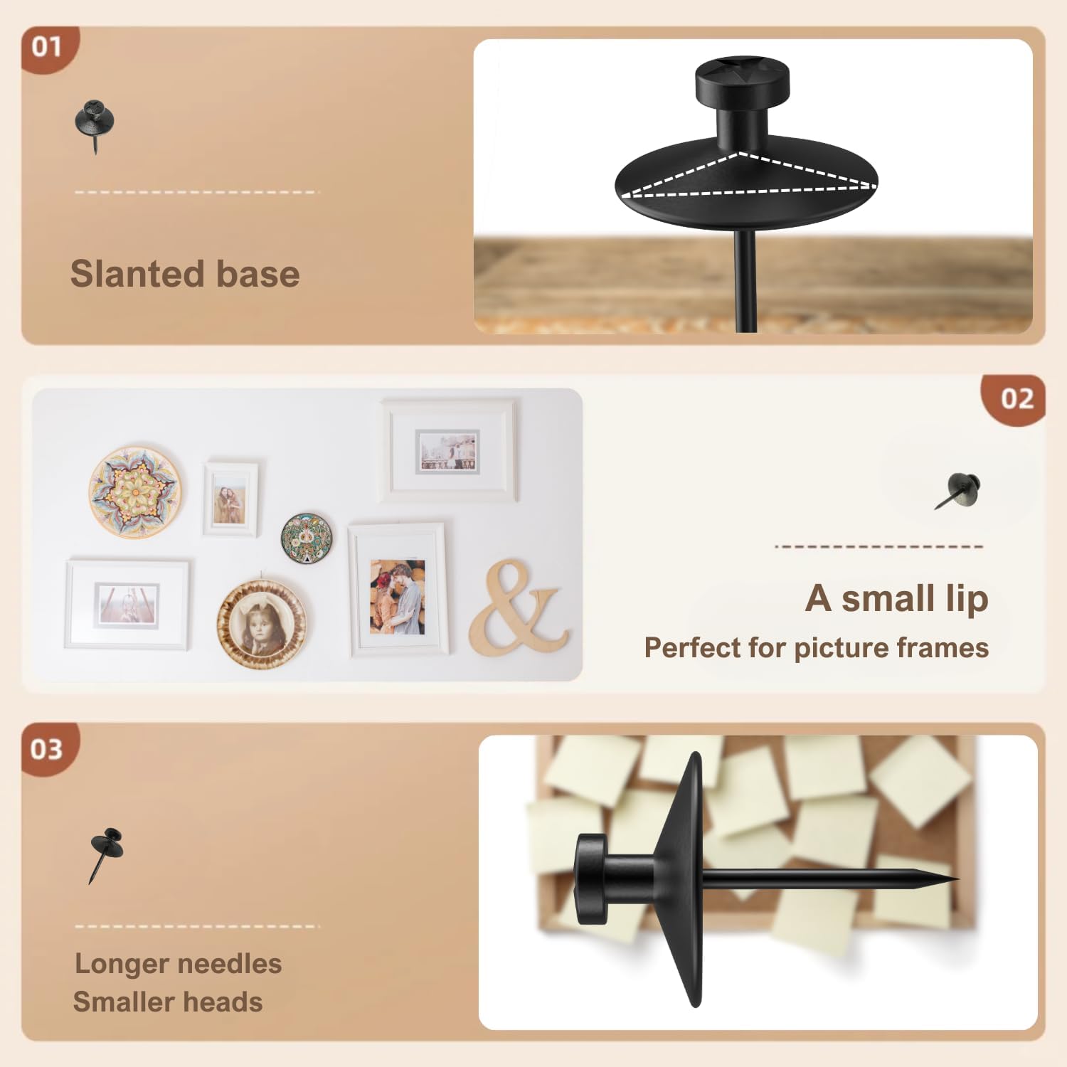 - Versatile Hanging Solution: Double-headed picture hanging nails provide a versatile solution for your wall décor needs. Whether you're hanging picture frames, tapestries, or using push pins for bulletin boards and walls, these hanging nails offer a secure and renter-friendly option for sprucing up any space