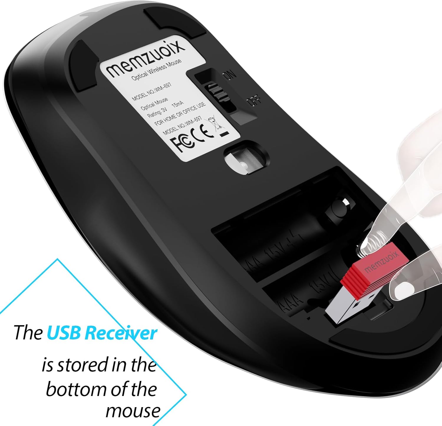 - 【Comfortable Hand-Feeling】 memzuoix 2.4G wireless mouse has modern contoured shape, sweat-resistant, and skin-friendly finish are for maximum comfort and support. The thoughtful ring and little finger rest provide extra comfort. The sturdy scroll wheel with rubber of usb mouse wireless makes sure that your hand will not slip when scrolling.