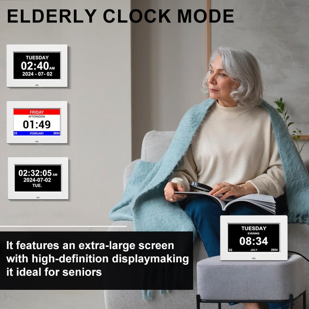- 【Elderly Clock】: It features an extra-large high-definition screen . The time, date, and day of the week are shown in large, non-abbreviated, and【 easy-to-read font, making it ideal for seniors】. Additionally, it includes 8 icon-based alarm groups for activities such as taking medication, exercising, and waking up. When an alarm goes on, the corresponding icon is displayed to remind you of the current activity. it has a voice time announcement feature that announces the time every hour