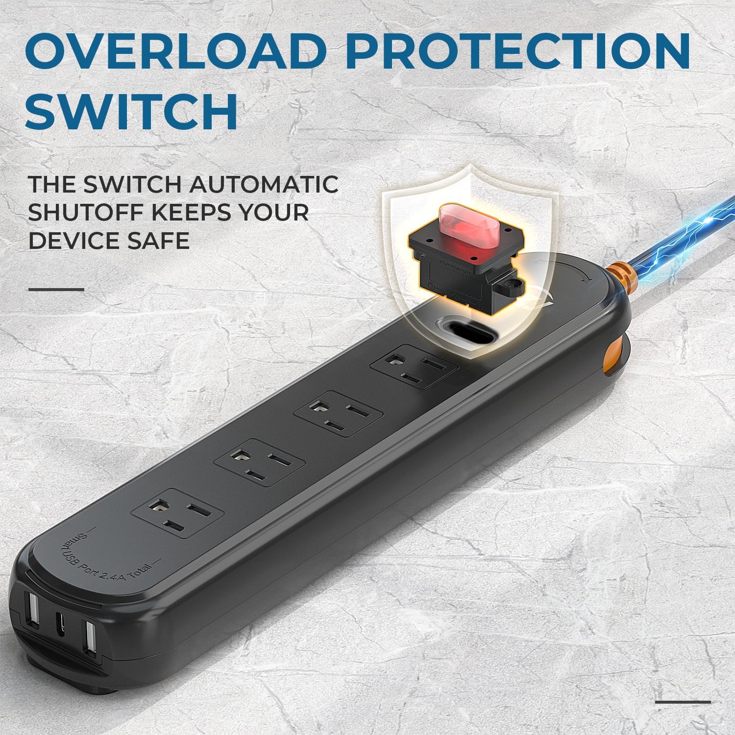 - Overload Protection Switch ON/OFF: The surge protector protects all connected equipment from voltage spikes, even during thunderstorms. The built-in circuit breaker shuts off when the total equipment power exceeds 1875W/15A, protecting you and your electronic equipment. Enclosure is made of 1382°F heat-resistant ABS+PC material to prevent overloads that can cause fires