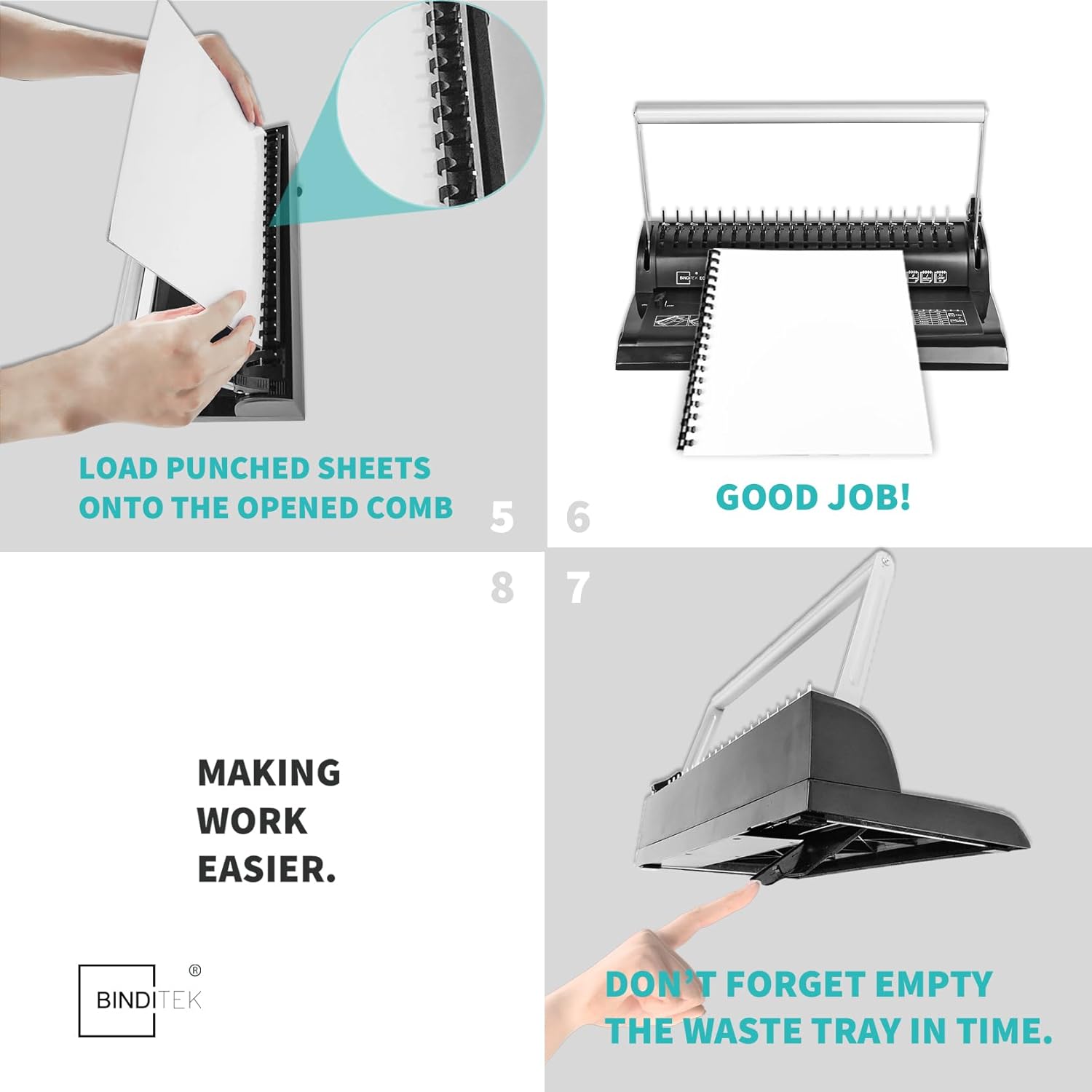 - 【Easy to Use, Just Punch and Bind】The comb binding machine features a dual-functional handle, allowing you to punch and bind in the one machine. (Punch Paper at Least 6 Times to Remove Oil.) This not only saves you time and energy but also make it effortless to create professional-looking bound books at home or in the office. Whether it's reports, manuals, or presentations, this comb binding machine is perfect for all your binding needs.