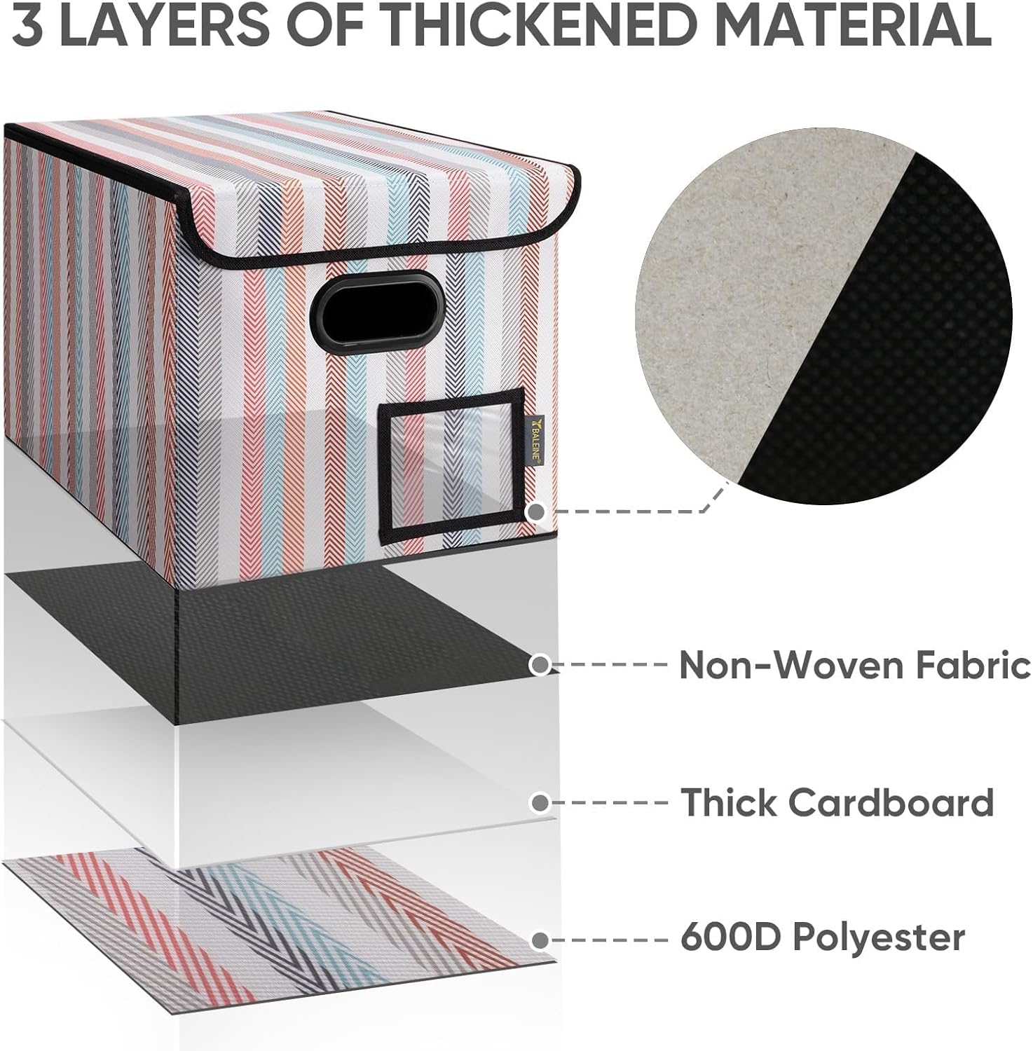 - [DURABLE MATERIAL] The outer layer of our filing box is crafted from high-quality polyester fabric and reinforced with thick cardboard in the middle. This construction ensures that the box maintains its shape and provides better bearing capacity for important documents and files. Its textured appearance can also serve as a stylish decorative element in any office or home.