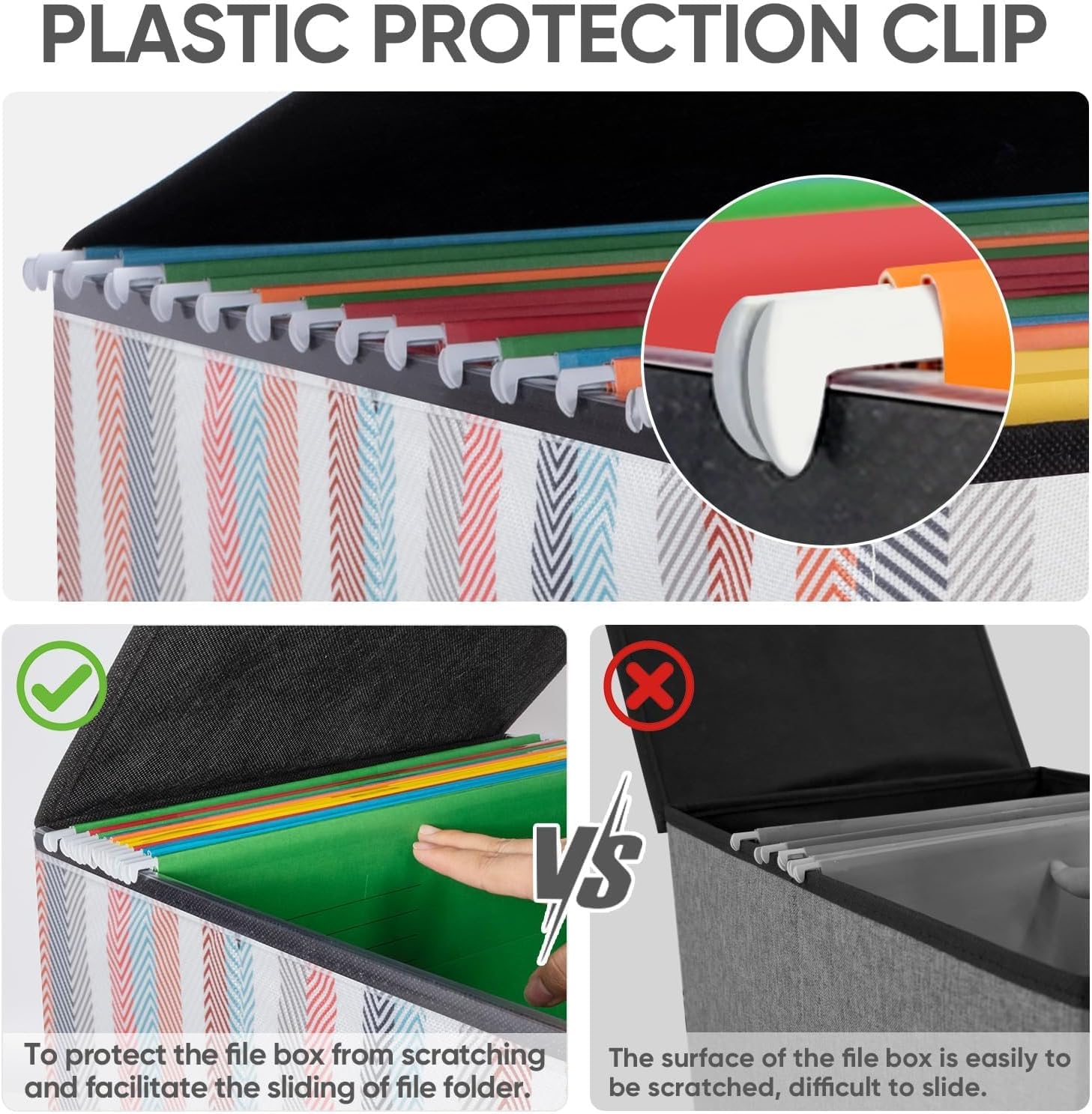 - [UNIVERSAL SIZE] Our file box with lid fits letter-sized files. It is designed for efficiency and functionality, with its smooth PVC slide rails on both sides, you can effortlessly slide file folders for easy access and neatly arranged. The lid fits snugly on the box after hanging folders. (NOTE: file folders are not included)