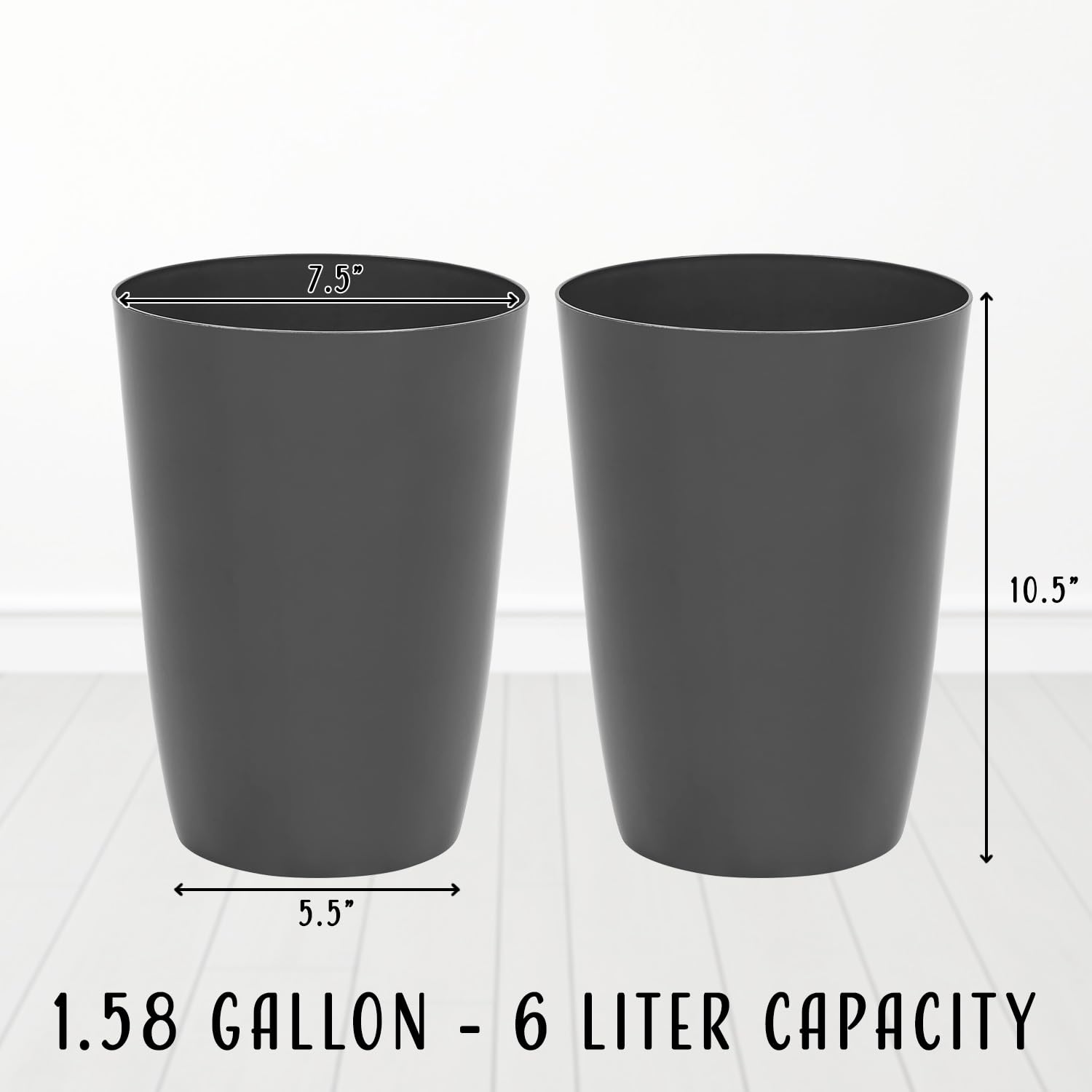 - 1.58-GALLON CAPACITY: A capacity of 1.58-Gallon / 6 - Liters, our wastebasket is suitable for your needs. Use it for small trash, recycling, paper waste and junk mail in the office, the bathroom or bedroom. The sleek design makes it easy to move around, and transport to empty out.