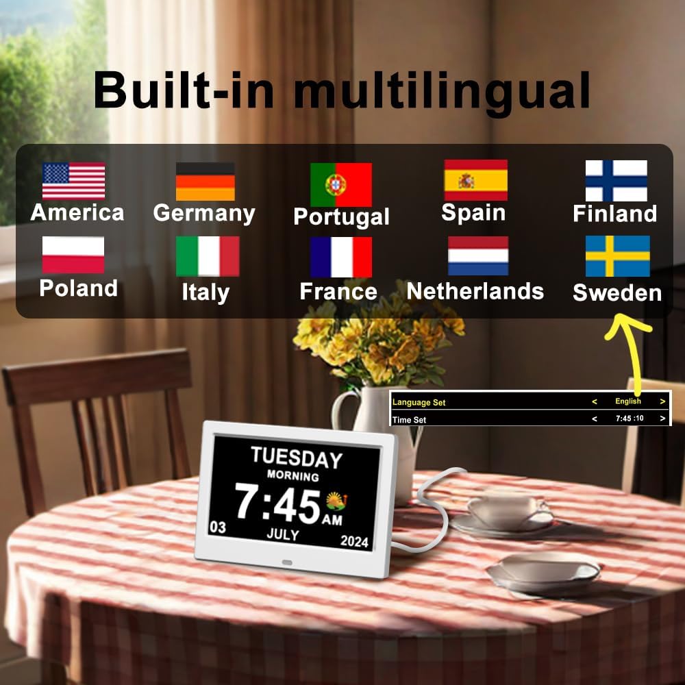 - 【Auto Diming, 10 national system languages】Screen brightness can be set to automatic diming mode, so brightness can be automatically adjusted during the day and night. You can also set a fixed brightness to meet your needs in different occasions; The clock is equipped with 10 national system languages: English, German, Spanish, Portuguese, French, Italian, Dutch, Czech, Polish, Swedish