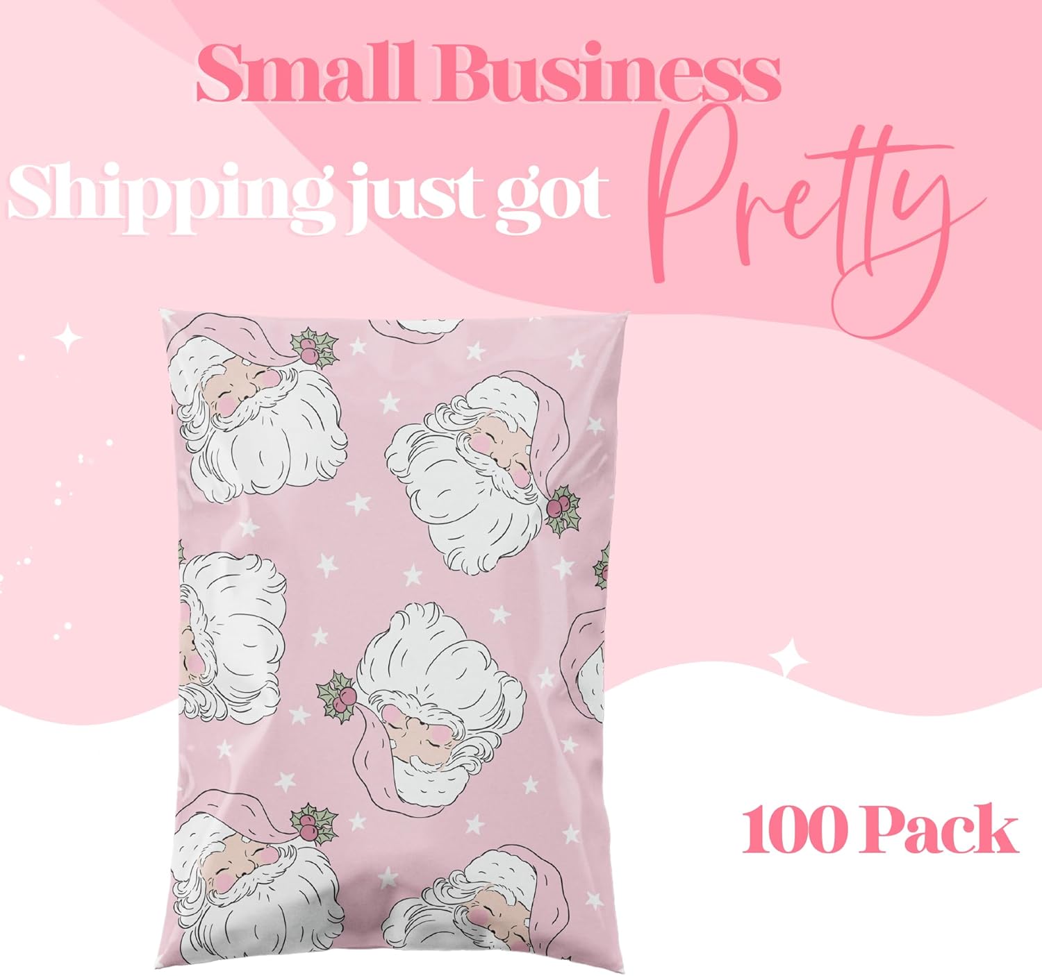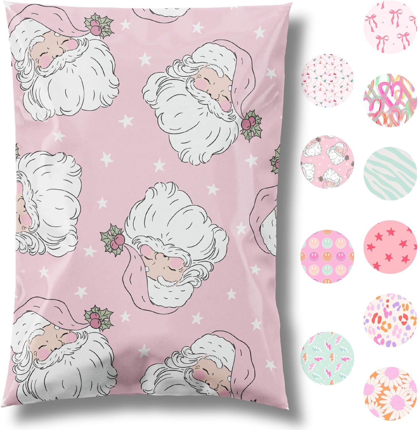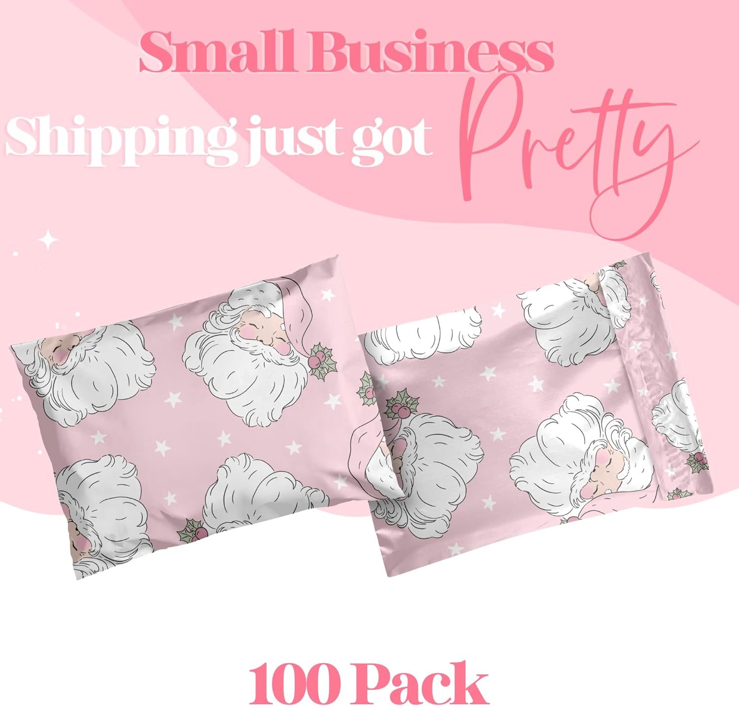 10x13 Designer Christmas Holiday Poly Mailer 100 Pack Heavy Duty Waterproof Self Seal Shipping Bags Large Mailing Envelopes Bulk Tear Resistant Cute Packaging Pink Santa