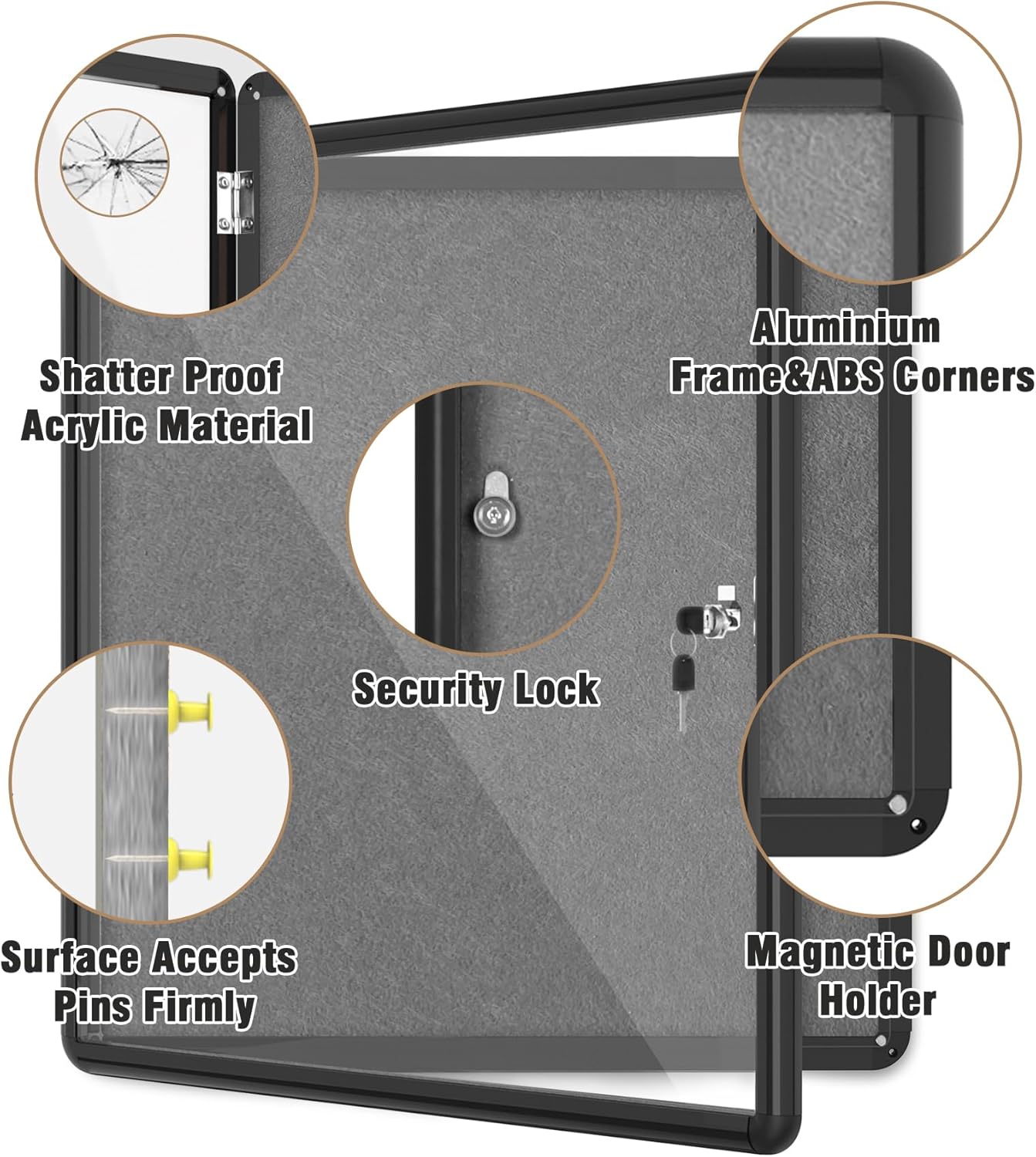28"x26" Enclosed Bulletin Board, Lockable Weather-Resistant Aluminum Cork Noticeboard for School & Office, Black Frame w/Grey Flet