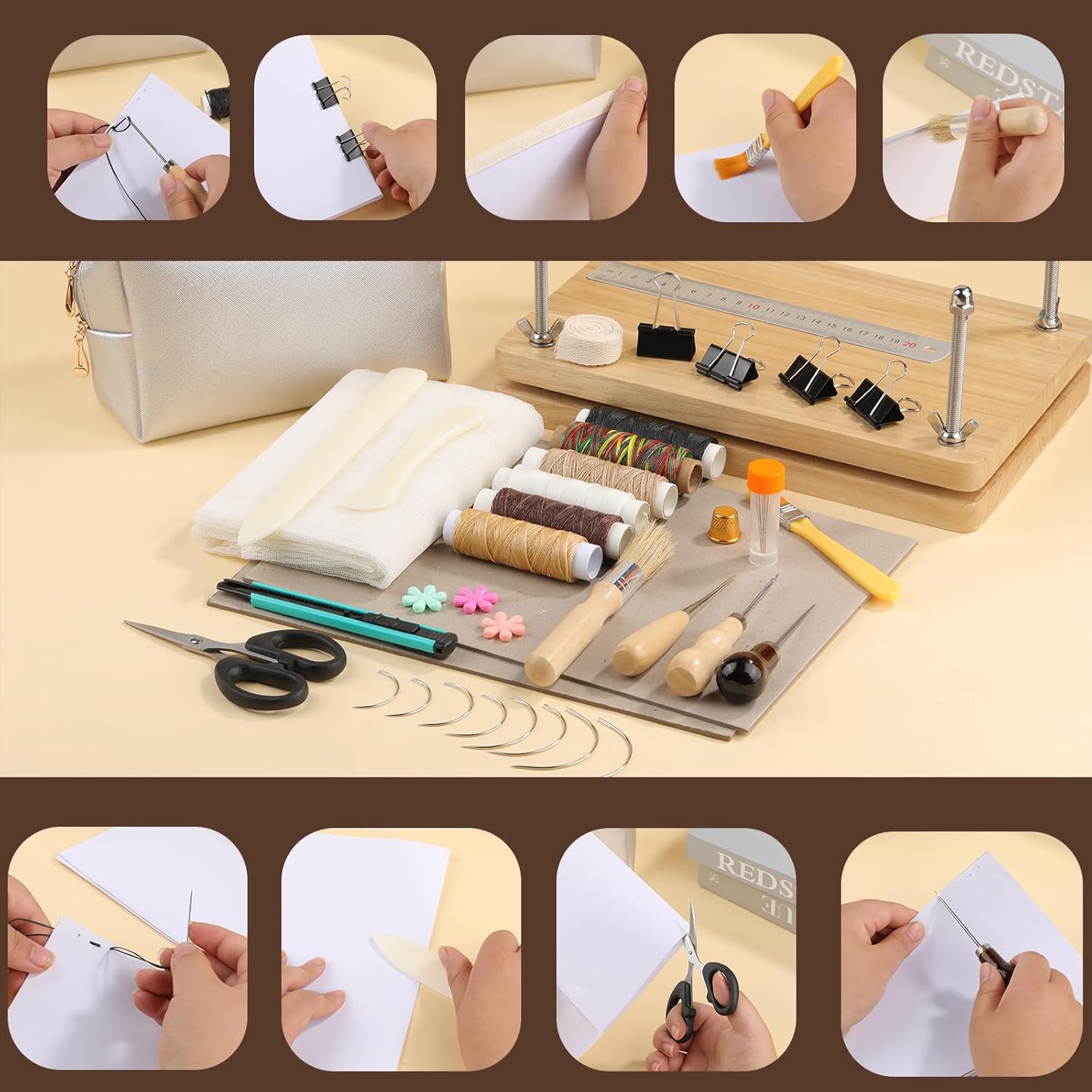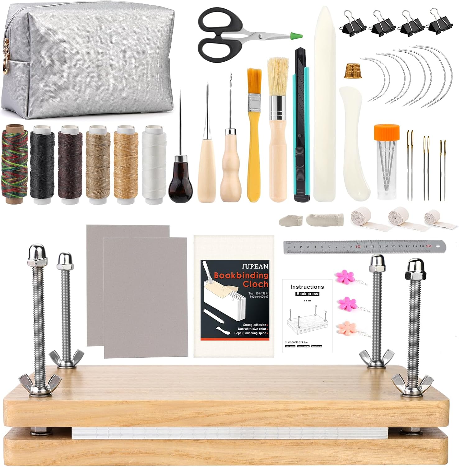 45 Pcs Book Binding Kits Bookbinding Kit Book Press 7.9”x11.6” with Book Binding Materials Bone Folder Tool Binding Cloth Webbing Strap and Storage Bag for Binding and Repair