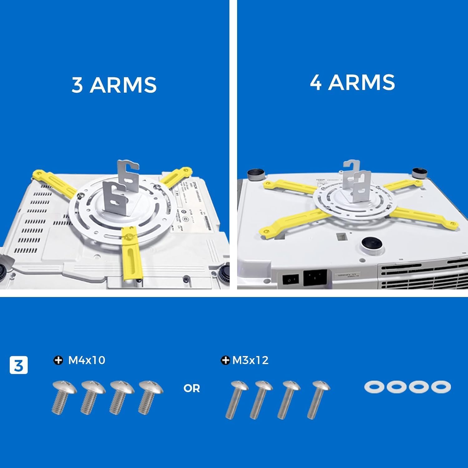 - Universal Compatibility: The SCREENPRO ceiling projector mount is designed to fit most mainstream home projectors on the market. Its black powder-coated finish blends seamlessly into the decor of most homes and offices. The adjustable base arms extend from 3.7 inches to 13.4 inches, accommodating various projector mounting patterns.
