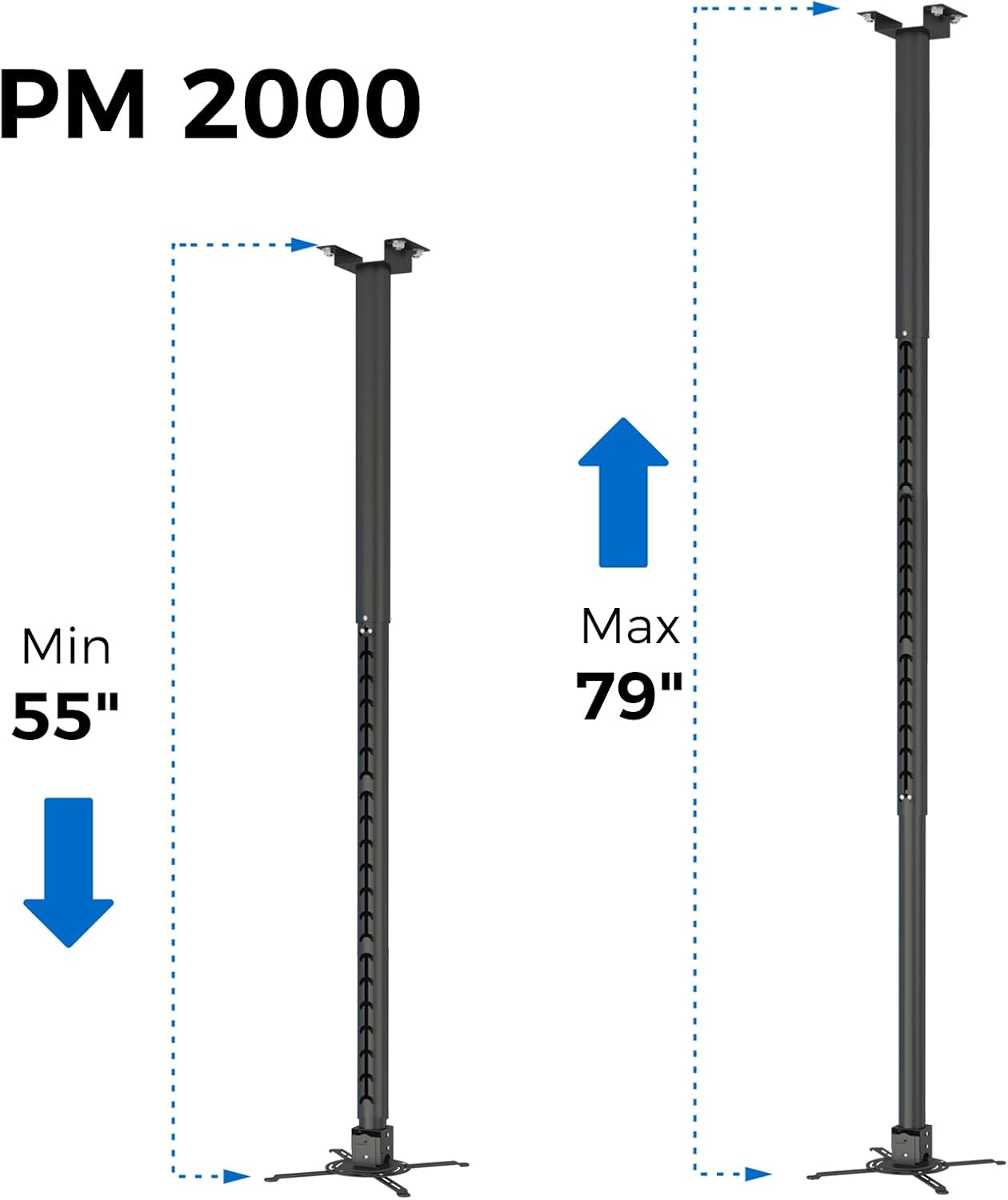 - Full Motion Adjustability: Equipped with a retractable aluminum column, the SCREENPRO ceiling projector mount allows for easy height adjustment to meet different installation requirements. It supports a 30° tilt, 10° swivel, and 360° rotation, ensuring the perfect viewing angle for any setup. The extendable arms adjust from 55 inches to 79 inches, offering flexibility in placement.