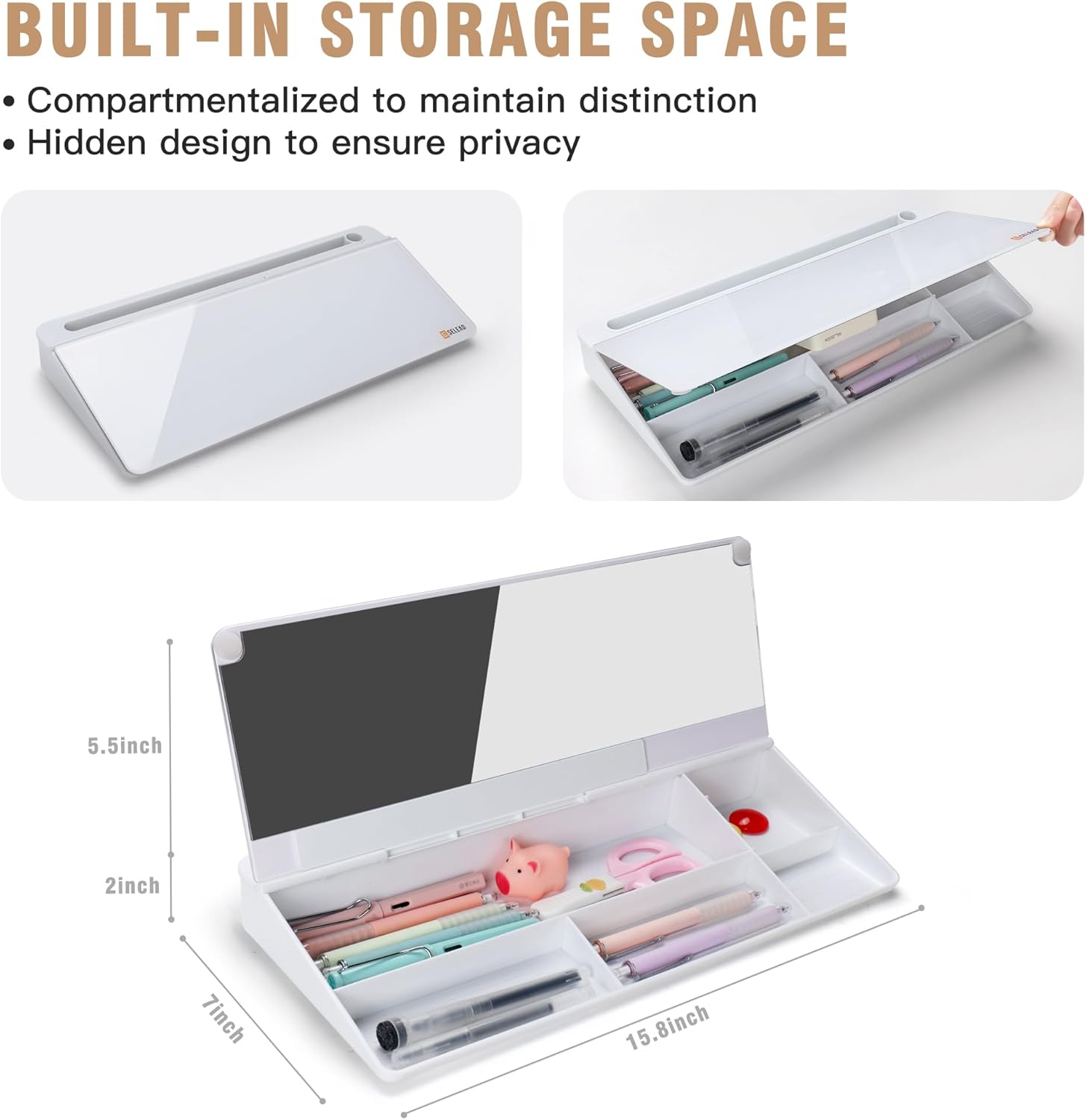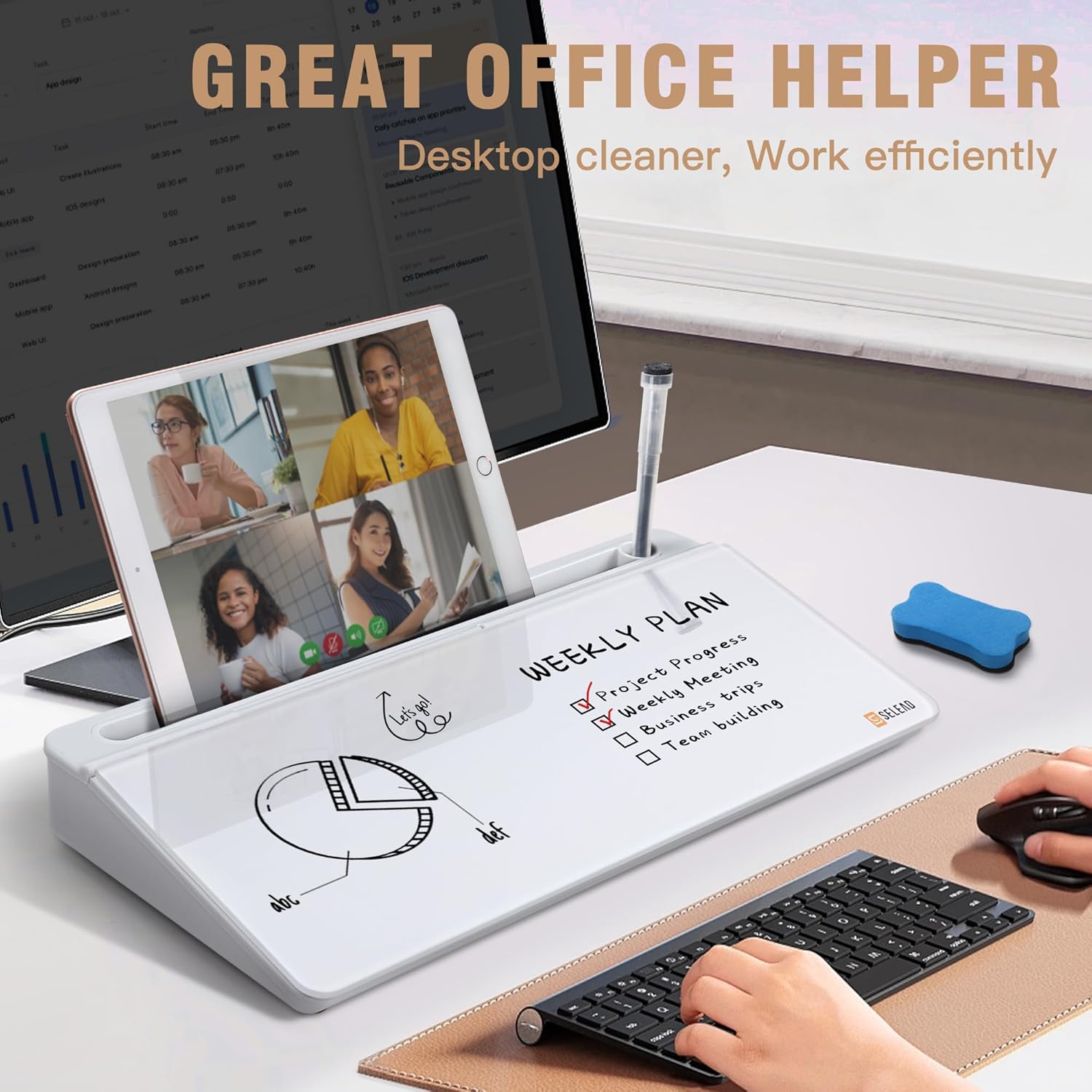 SELEAD Desktop Glass Whiteboard with Organizer & Built-in Mirror, Small Dry Erase White Board Computer Pad Keyboard Stand for Home, School, Office Desk Accessories - White