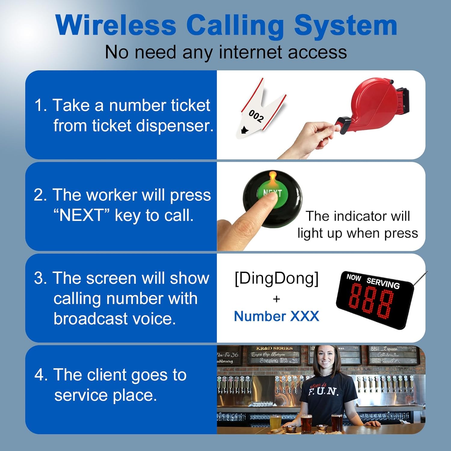 Take a Number System Queue Wireless Calling System with 1 Take a Number Display 2 Next Call Button 1 Ticket Dispenser 3-Digit Ticket Roll