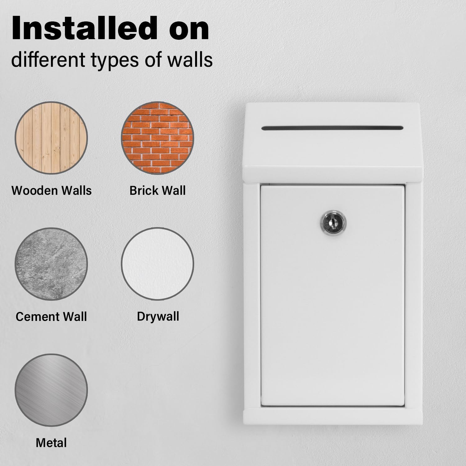 Metal Donation Box with Lock, Wall Mounted, Suggestion Box with 4 Iron Keys, White, Cash Drop Box with Slot, 1-Pack