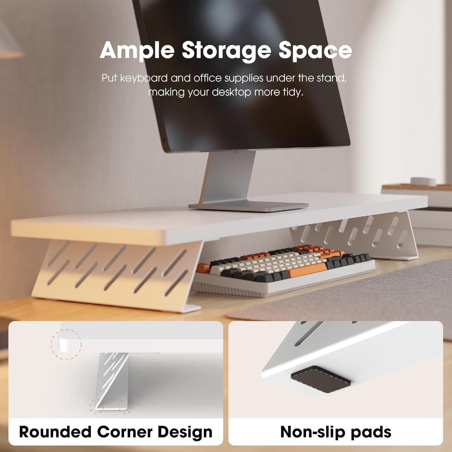 - 【Space-saving, Well-organized】The top shelf is for placing the computer monitor, and decent spacing at the bottom to slide in peripherals. You can also thread your cables through our computer stand to hide them, making the desktop more tidy.