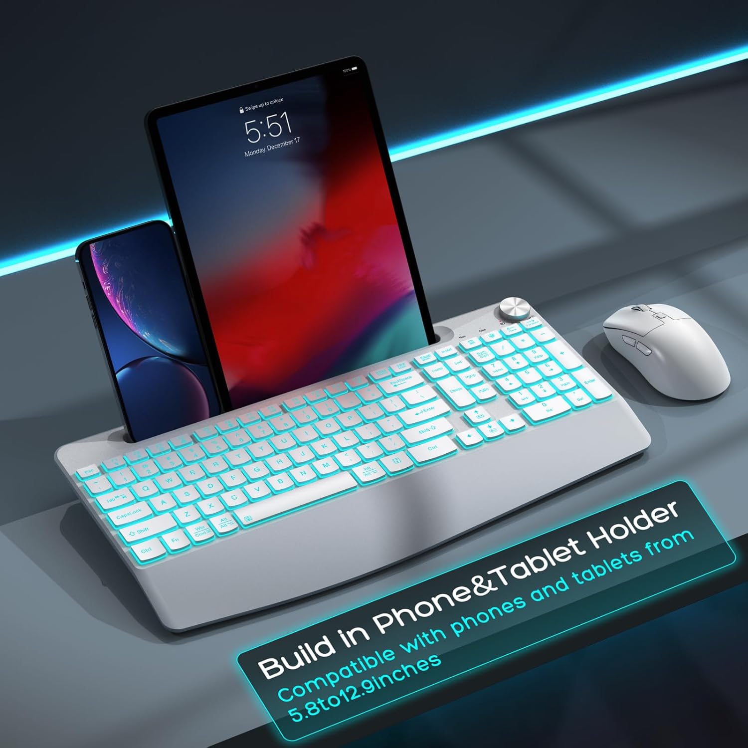 Wireless Keyboard and Mouse Backlits - Full-Sized Ergonomic Lighted Keyboard with Wrist Rest, Phone Holder,2.4GHz Rechargeable Silent Keyboard Mouse Combo for Computer, Laptop, PC, Mac -White