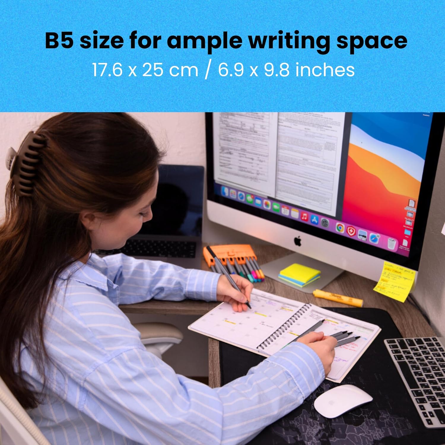 - Premium Quality - Made beautiful and tough to withstand the rigours of your busy lifestyle and look good doing so! Adorned with a hardcover and tear-proof outer cover to hold strong against bumps and scuffs,120 GSM thick pages to prevent bleed and metal spiral binding to hold it all planner notebook 2025-2026 together.
