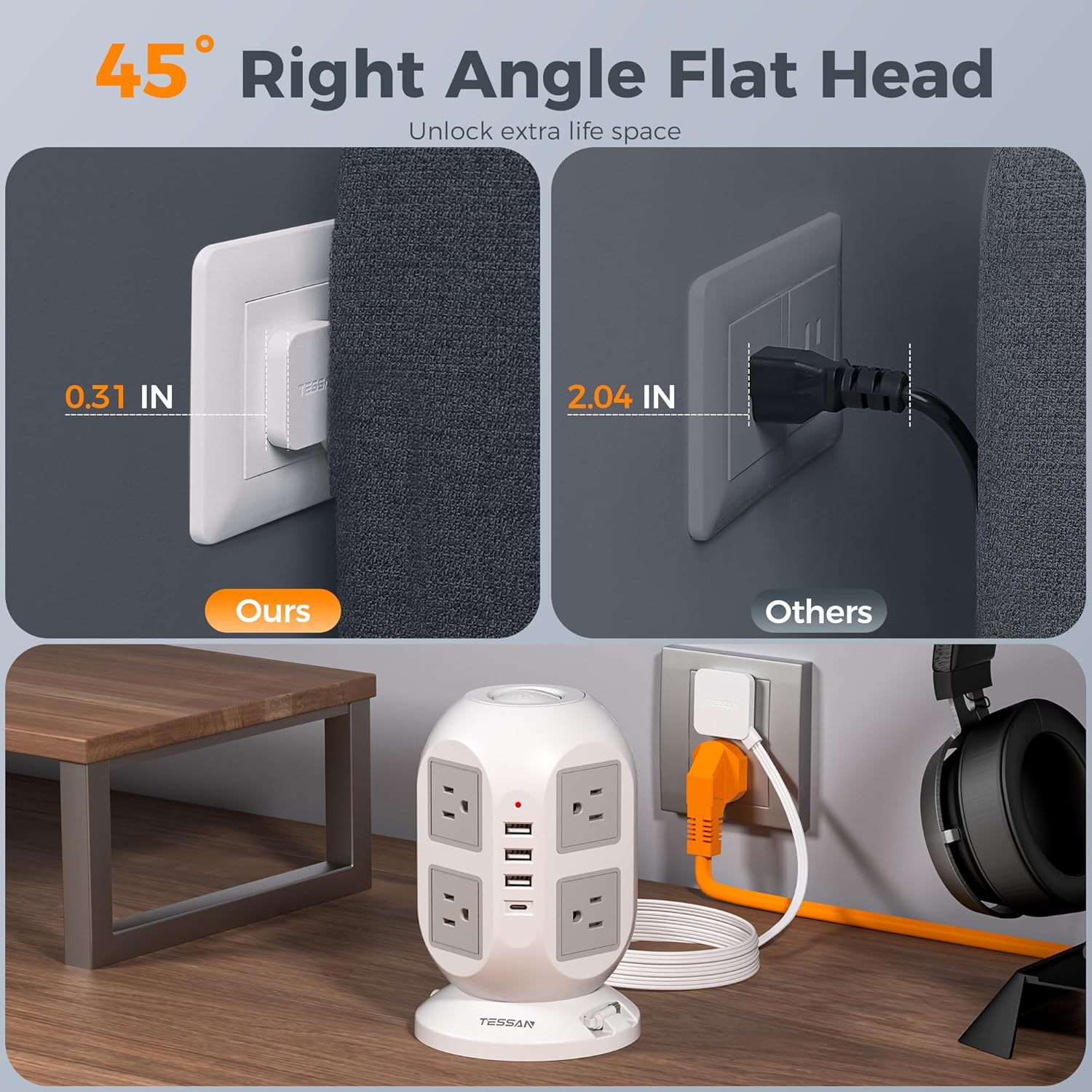 - Flat Extension Cord 10 Ft: Flat plug power strip 10ft allows you to easily reach distant power outlets; With 0.31 in ultra thin flat head design, extension cord flat wall plug can easily fit in tight spots and hide behind sofa, bed or other furniture; 45 degrees right angle design creates an extra space for other plug below without blocking