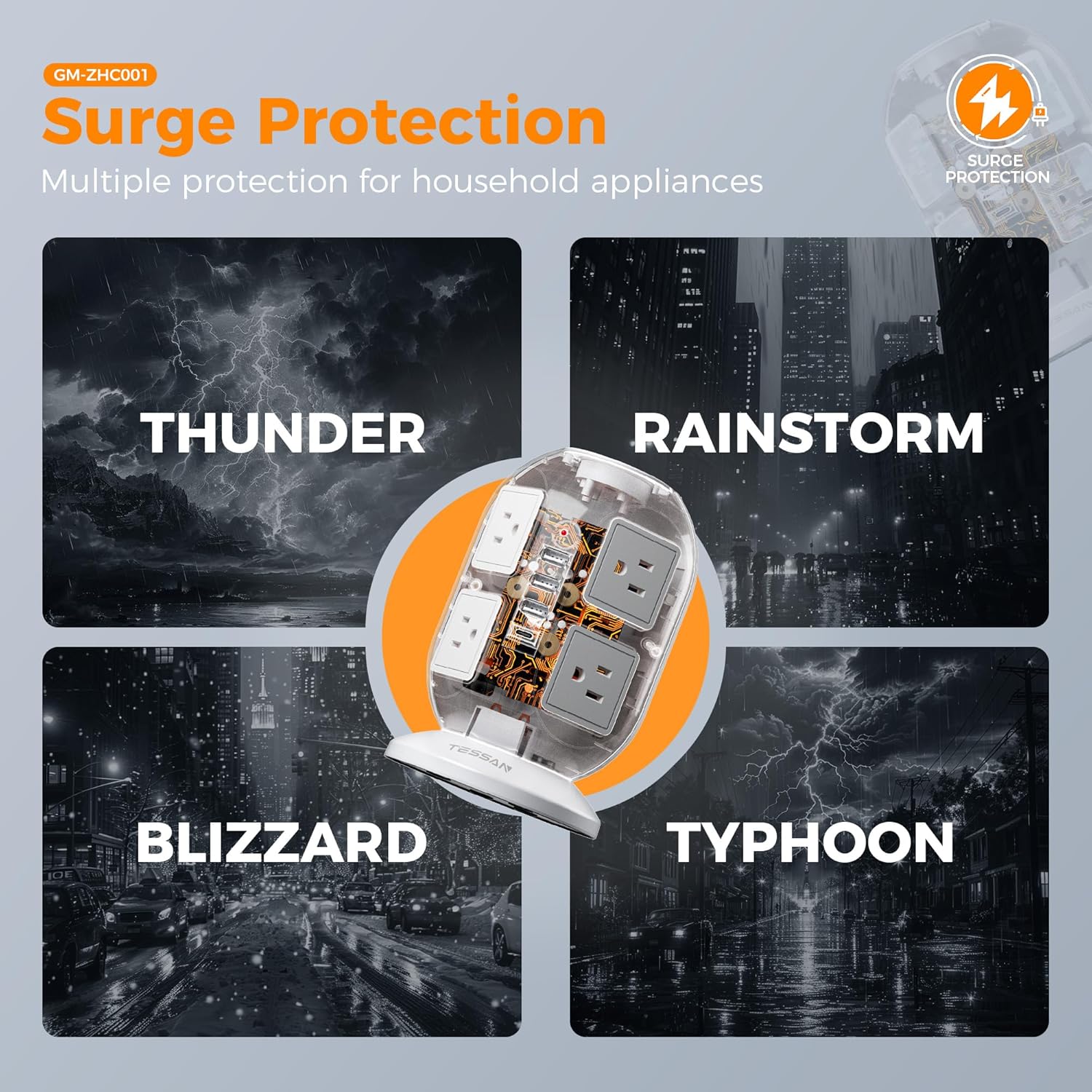 - Space Saving Design: 4-side compact design extension cord tower takes up little space on your desk, cleans various cords and create a neat and tidy space; Stable base with 4 rubber feet at the bottom, efficiently keeps this surge protector tower from slipping and sliding