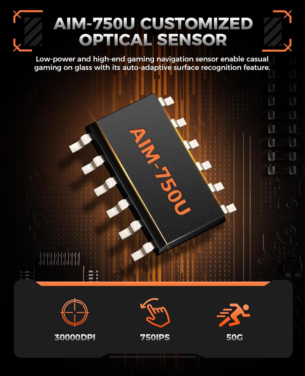 - AIM-750U 30K OPTICAL SENSOR-Sensor of the wireless gaming mouse features auto-adaptive technology that automatically adjusts to different desktop surfaces to improve mouse precision. Easily play games on glass and textured surfaces, capable of 750 IPS speed, 50g acceleration, and 30,000 programmable DPI.