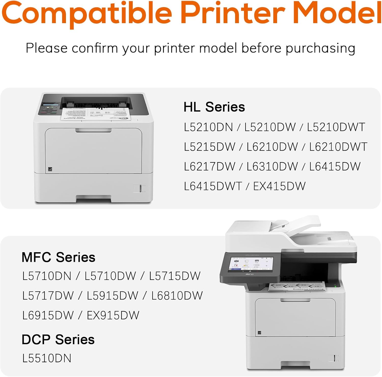 - Compatible Devices : Compatible printers:HL-L6210DW ,HL-L6210DWT HL-L5210DN HL-L5210DW HL-L5210DWT HL-L6310DW HL-EX415DW HL-L5215DW HL-L6217DW HL-L6415DW HL-L6415DWT DCP-L5510DN MFC-EX915DW MFC-L5710DN MFC-L5710DW MFC-L5715DW MFC-L5717DW MFC-L5915DW Compatible printers:HL-L6210DW ,HL-L6210DWT HL-L5210DN HL-L5210DW HL-L5210DWT HL-L6310DW HL-EX415DW HL-L5215DW HL-L6217DW HL-L6415DW HL-L6415DWT DCP-L5510DN MFC-EX915DW MFC-L5710DN MF… See more
