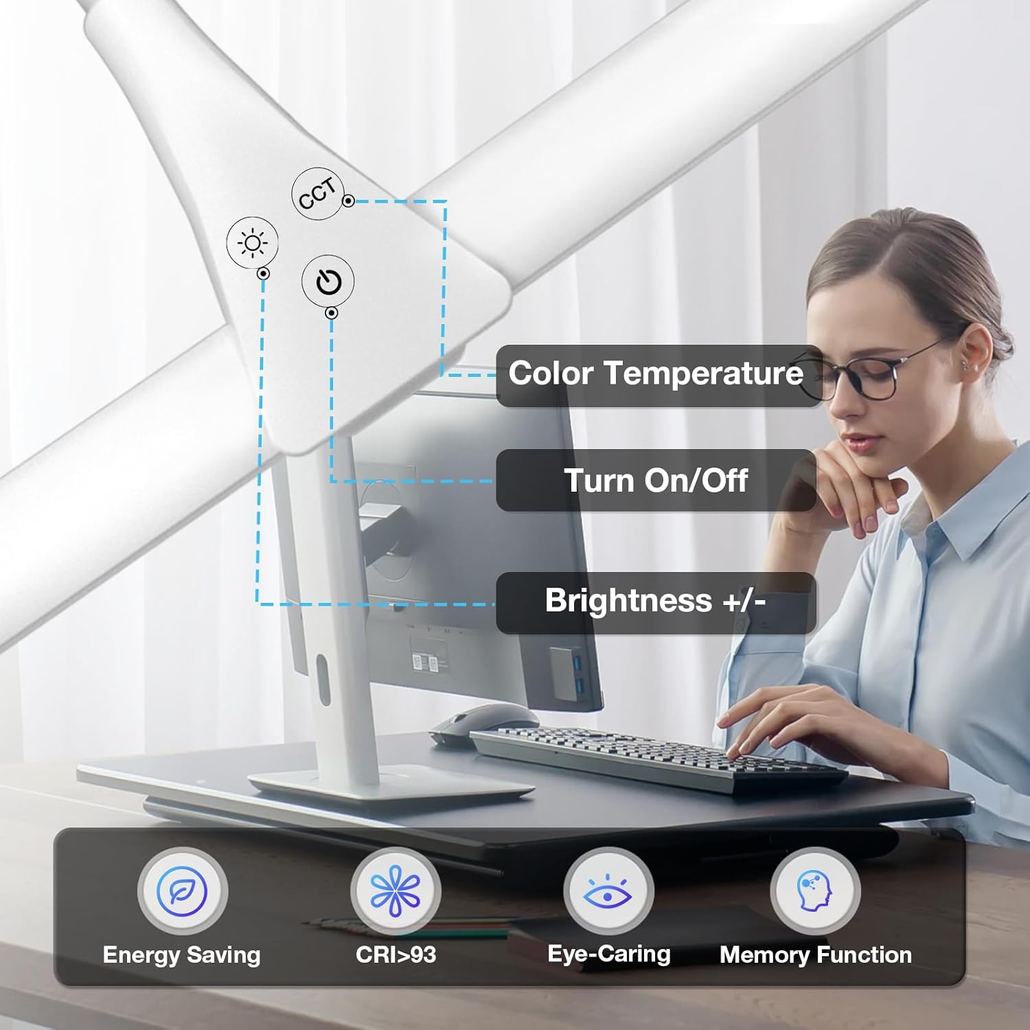 - Eye-Caring&Memory Function: home desk light features comfortable and soft light of CRI>93, 1800lm. No glare, flicker and ghosting, adjustable light settings help you better adapt to the vision. The previous brightness and color mode will be retained as long as being properly turned off via power button