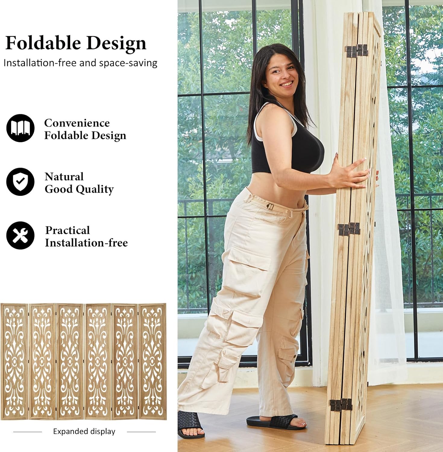 5.6Ft Room Divider Folding Wood Classical Carved Partition Screen for Home Office Garden - 6 Panels (Natural)
